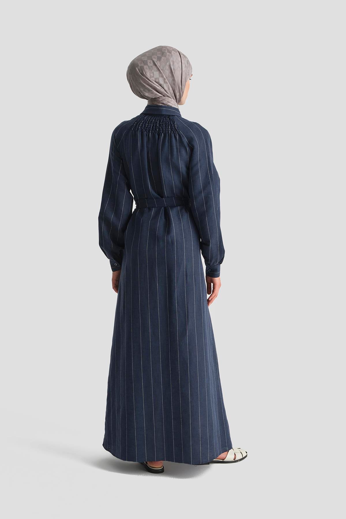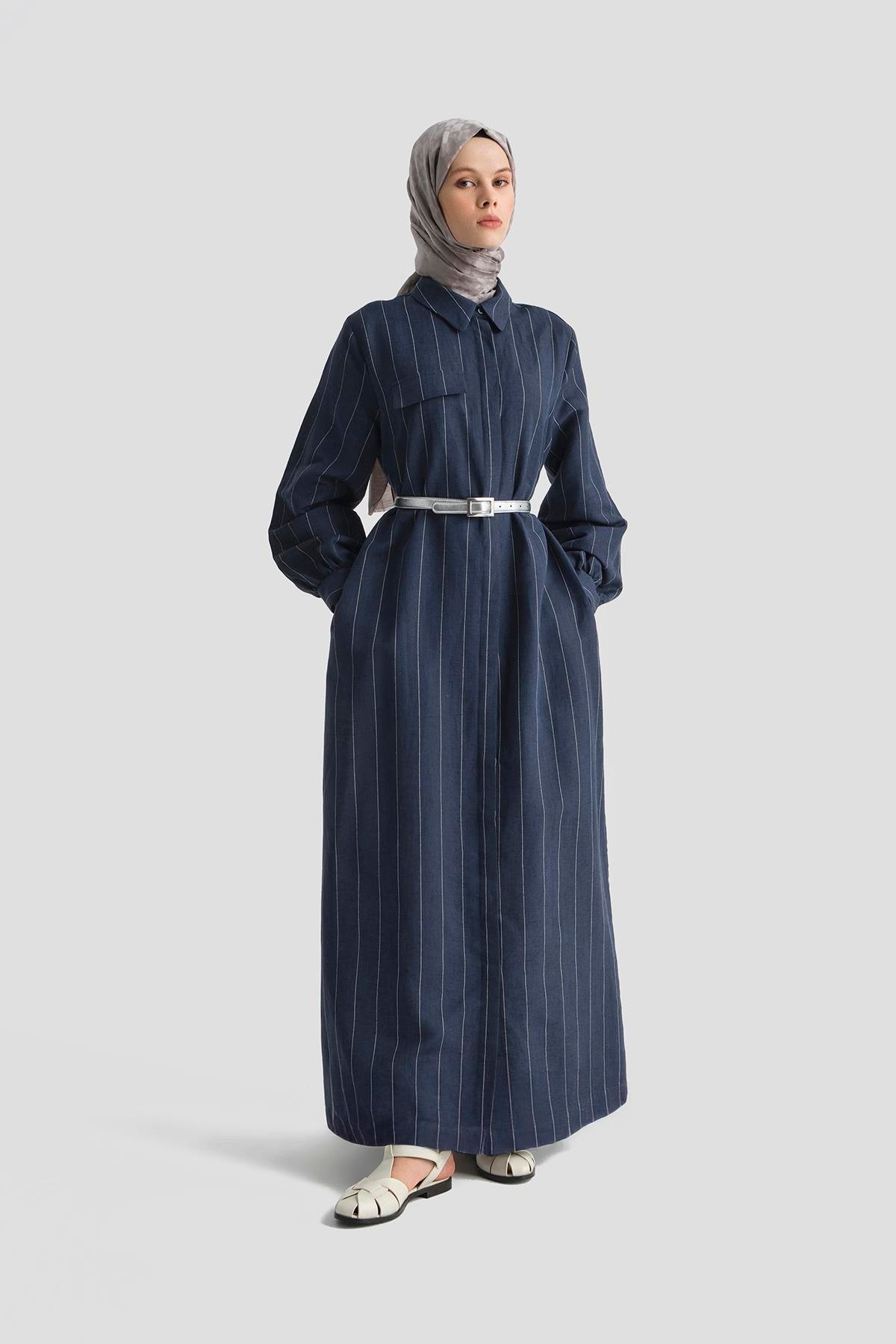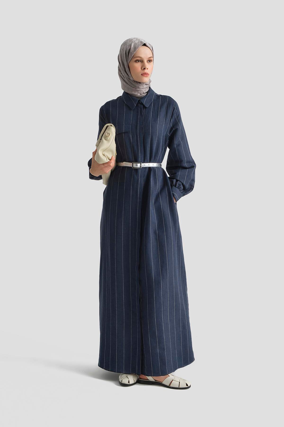 يُقدّم هذا الفستان الطويل بروح بحرية أنيقة مع خطوط بيضاء رفيعة على خلفية زرقاء داكنة، حيث يدمج الإيحاءات البحرية بأسلوب حضري عصري. يتميّز بقماش الكتان المنعش الذي يضمن الراحة طوال اليوم، مع ياقة قميص وحزام قابل للتعديل يؤكدان على الأناقة، وجيوب جانبية تضيف لمسة عملية. مثالي للأيام الممتدة من الصيف إلى الخريف، حيث يُضفي نسمة بحرية مع لمسة عصرية إلى إطلالاتك.