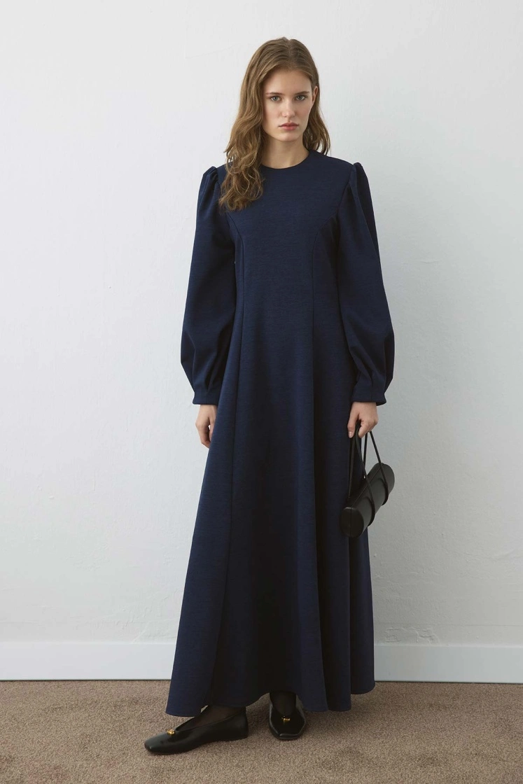 فستان أزرق داكن بتفاصيل جلسة خصر متميزة