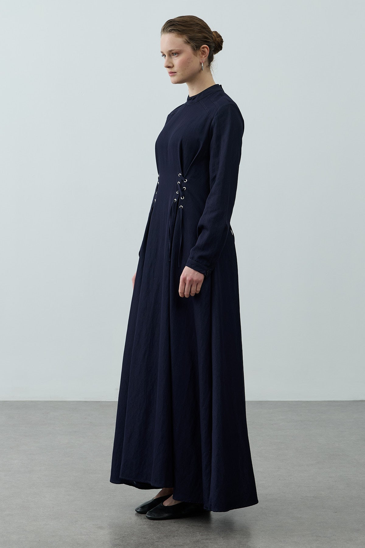 فستان من قماش منسوج ذو ملمس مميز، يضم ياقة ماندارين، وإغلاق بسحاب من الخلف، وتفاصيل عين الطائر عند الخصر، وأكمام طويلة بأطراف، وطول ماكسي.