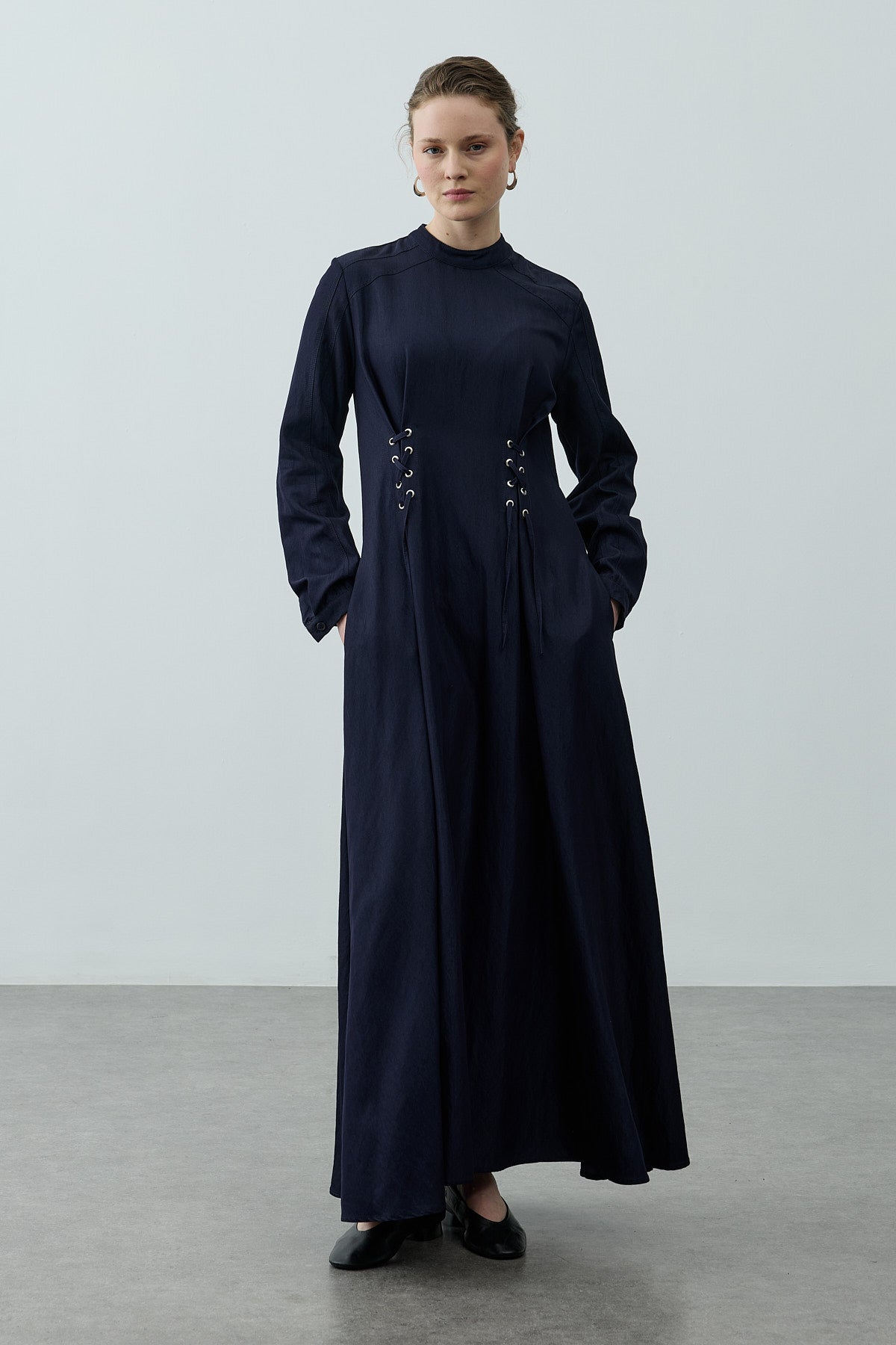فستان أزرق نيلي بخصر مربوط بتفاصيل عين الطائر