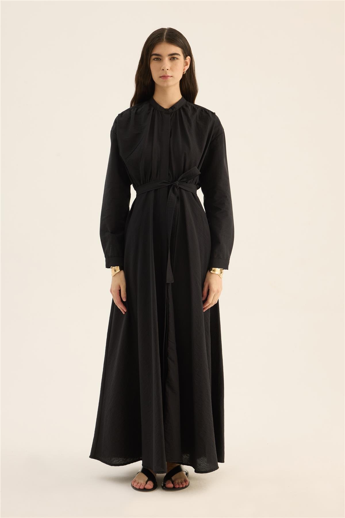 يتميز هذا الفستان الأسود بملمسه الطبيعي وسطحه المكرمش الخفيف، وهو مصنوع من قماش مزيج بنسبة 88% قطن و12% بوليستر. يمنح الحزام الموجود عند الخصر شكلاً أنيقاً للجسم، بينما يضمن القص المريح الراحة طوال اليوم. بتركيبته المناسبة لموسم الصيف، يُشكل بديلاً أنيقاً لكل من الملابس اليومية وملابس المناسبات الخاصة.