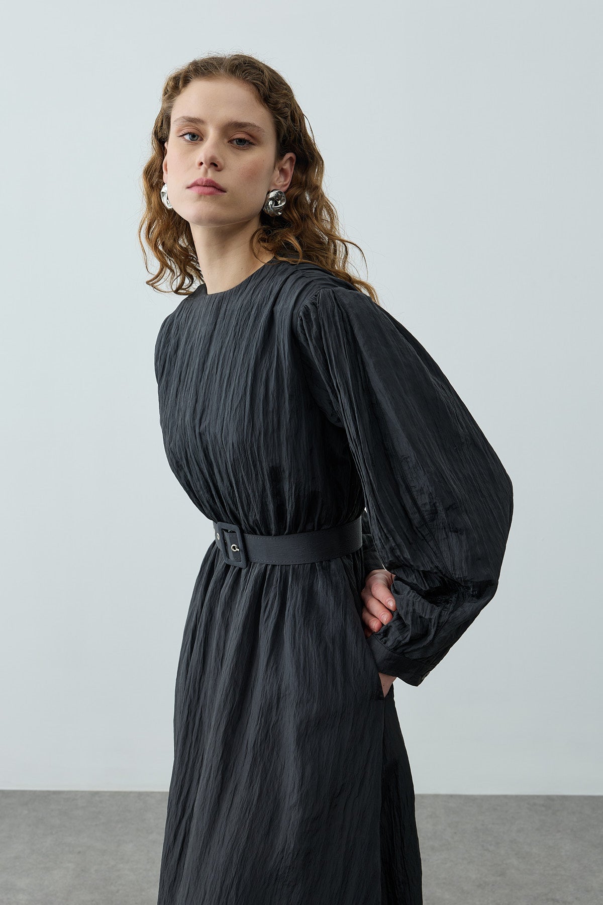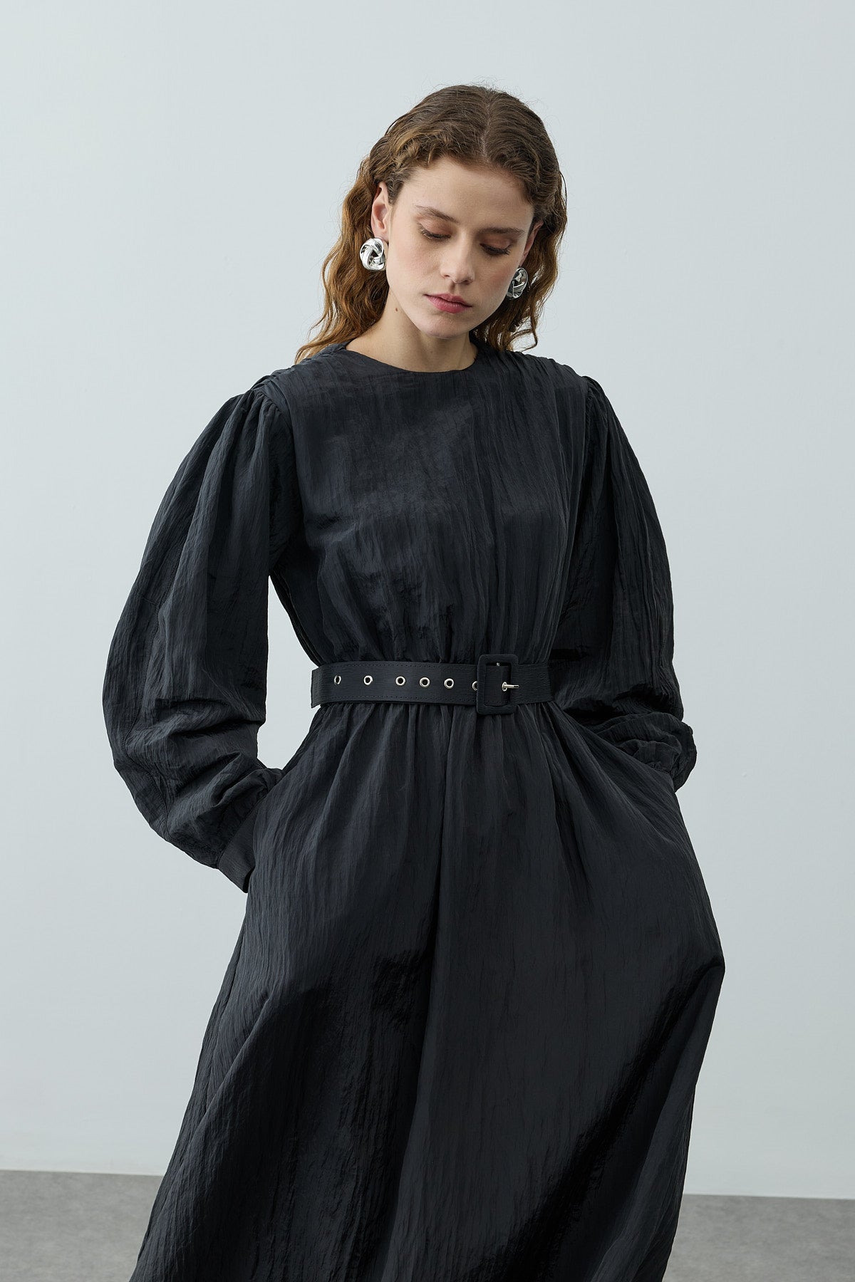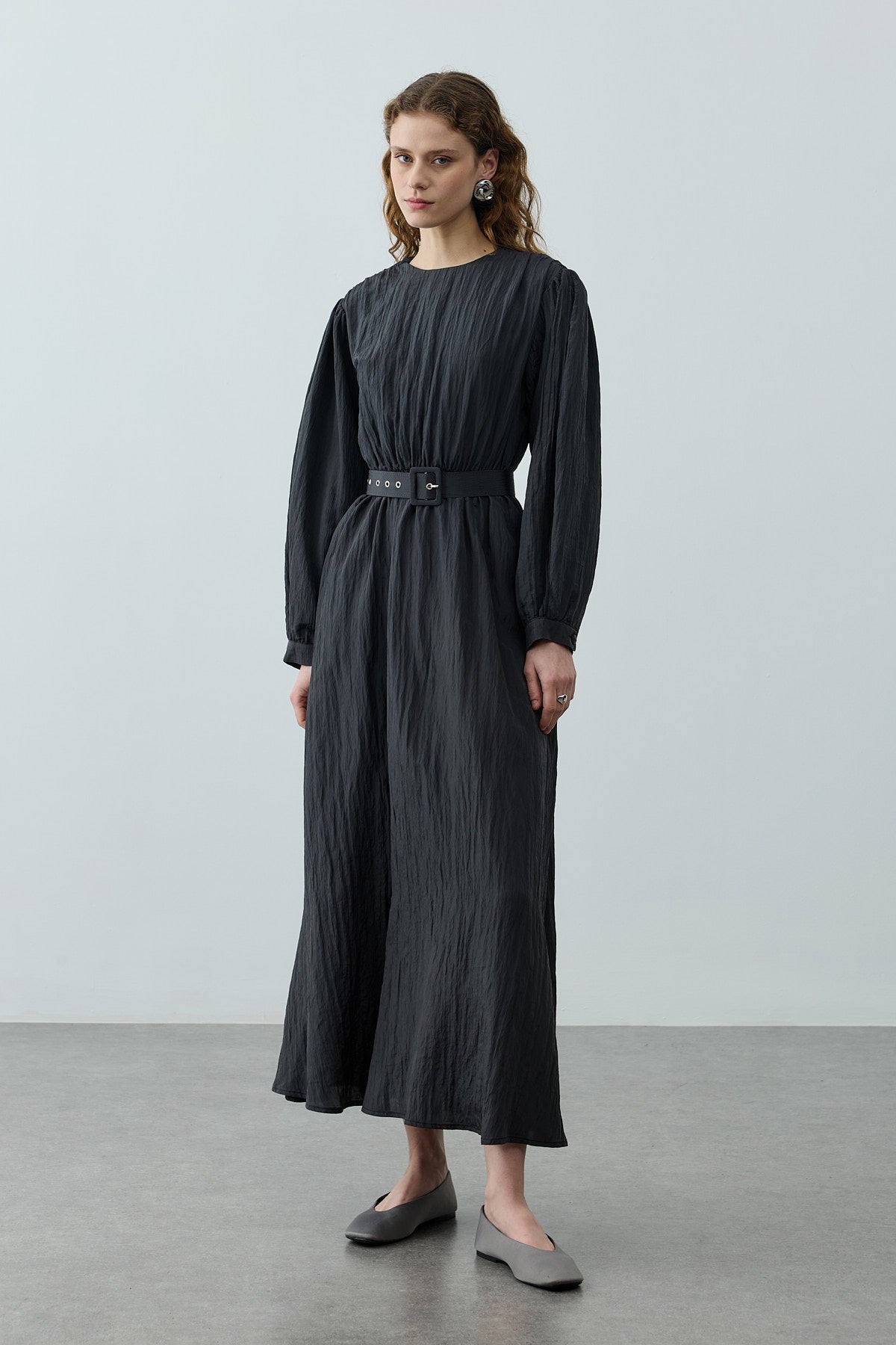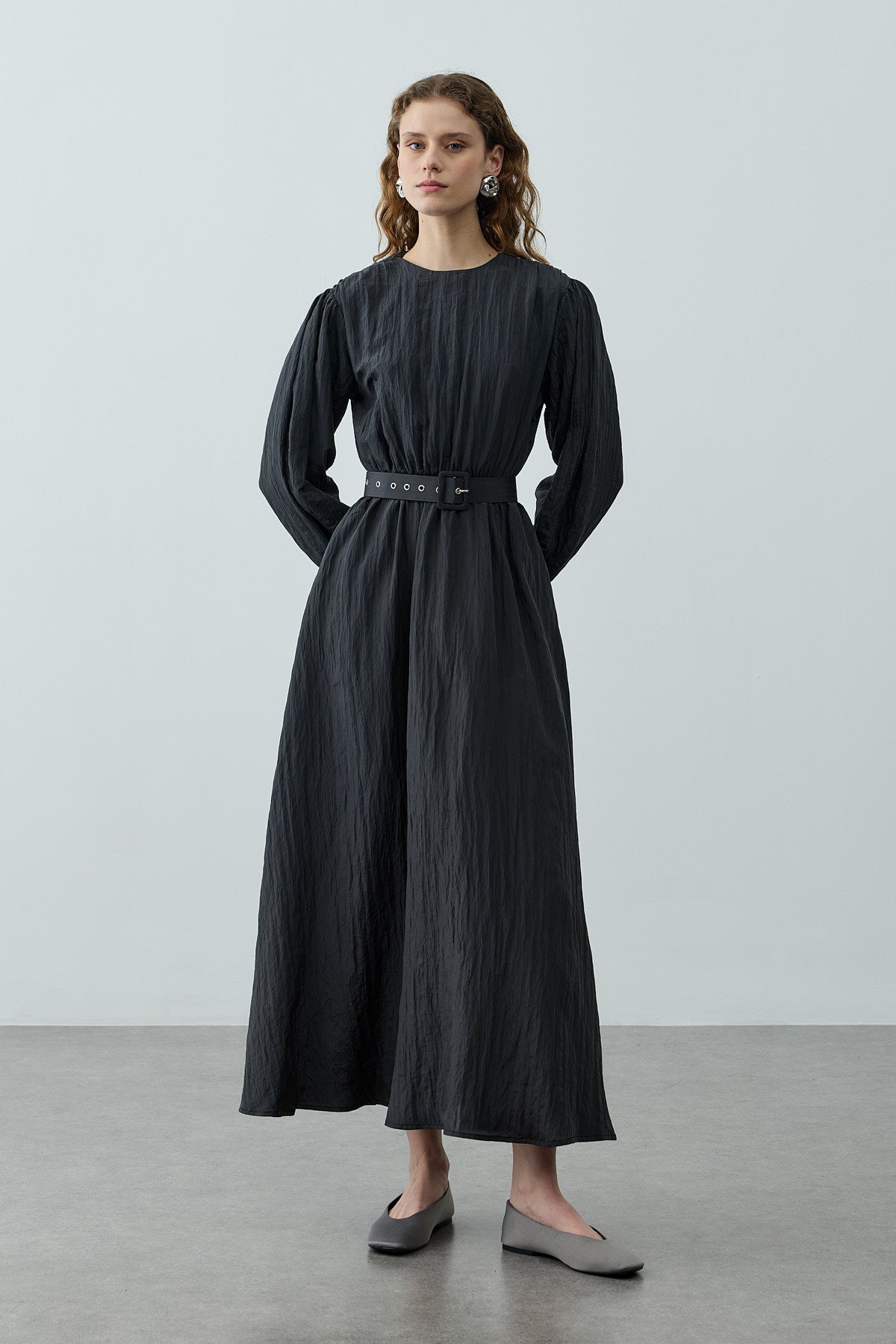 فستان طويل مصنوع من قماش منسوج مطوي ذو لمعان خفيف، يتميز بخط عنق مستقيم، إغلاق بسحّار من الخلف، أكمام بالون طويلة، خصر مرن بحزام مطاطي، وحزام مصنوع من نفس القماش مع مشبك إغلاق.