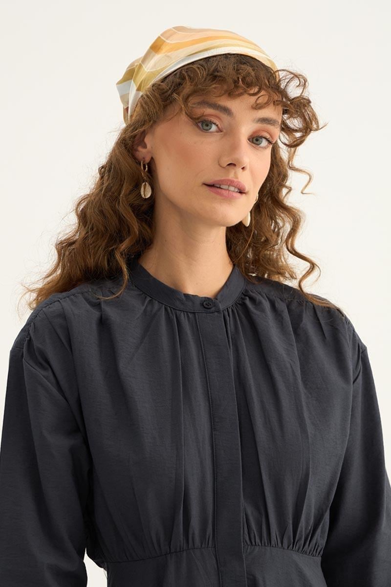 يتميز هذا الفستان الأنثراسايت بقوامه الطبيعي وسطحه المجعد قليلاً، وهو مصنوع من قماش مكون من 88% قطن و12% بوليستر. الحزام عند الخصر يمنحك قواماً أنيقاً بينما القص المريح يضمن الراحة طوال اليوم. بتصميمه المناسب للصيف، يعد خياراً أنيقاً للارتداء اليومي وللمناسبات الخاصة.