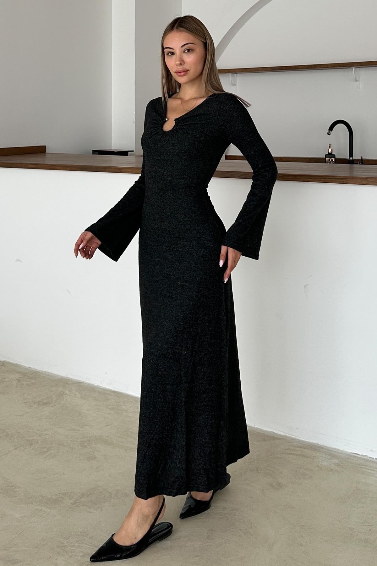 فستان أنثراسايت محبوك مع إكسسوارات أمامية ANTRASİT 9367-E