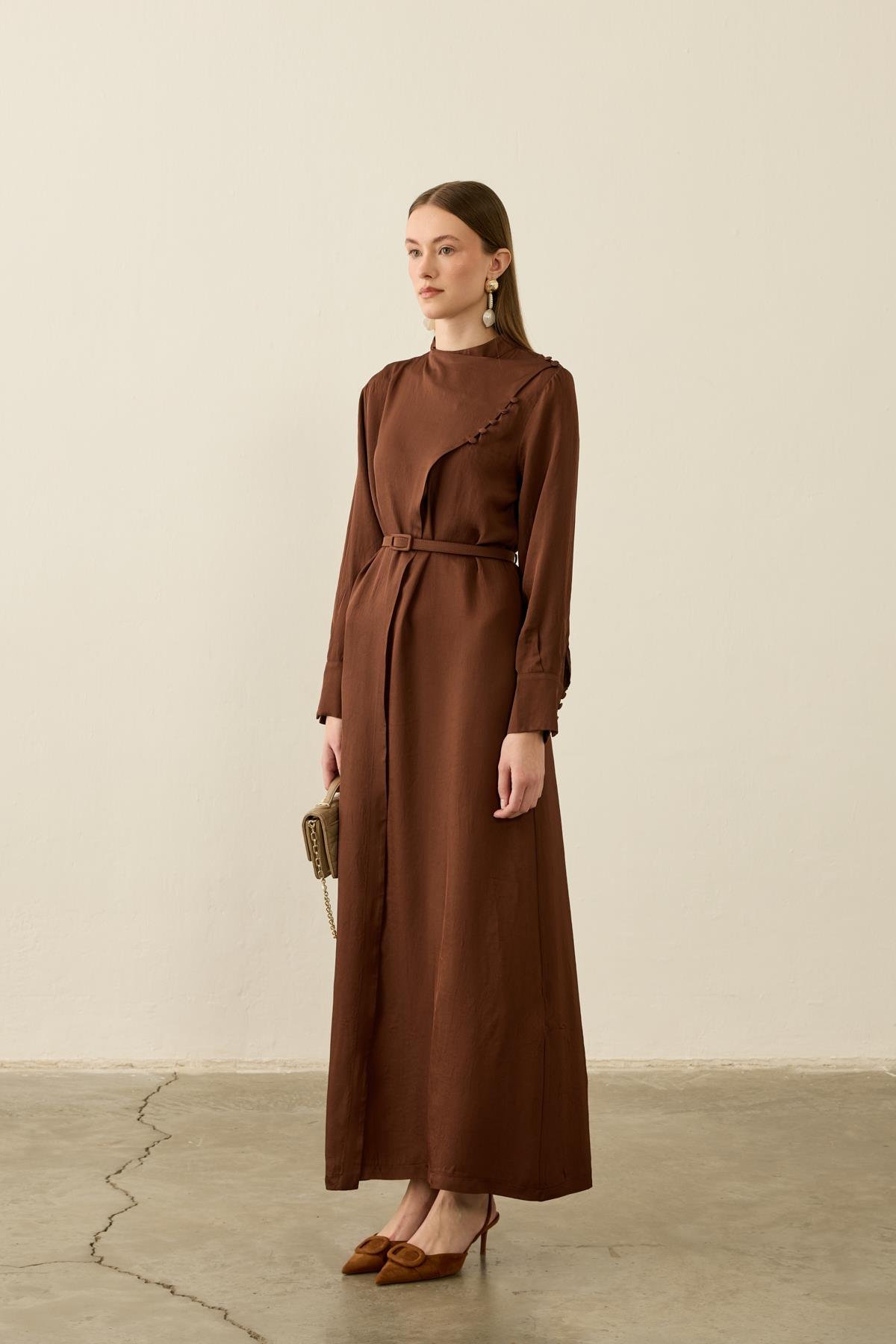 فستان أوليفيا الأنيق البني بحمالات الكتف والتطريز المموج