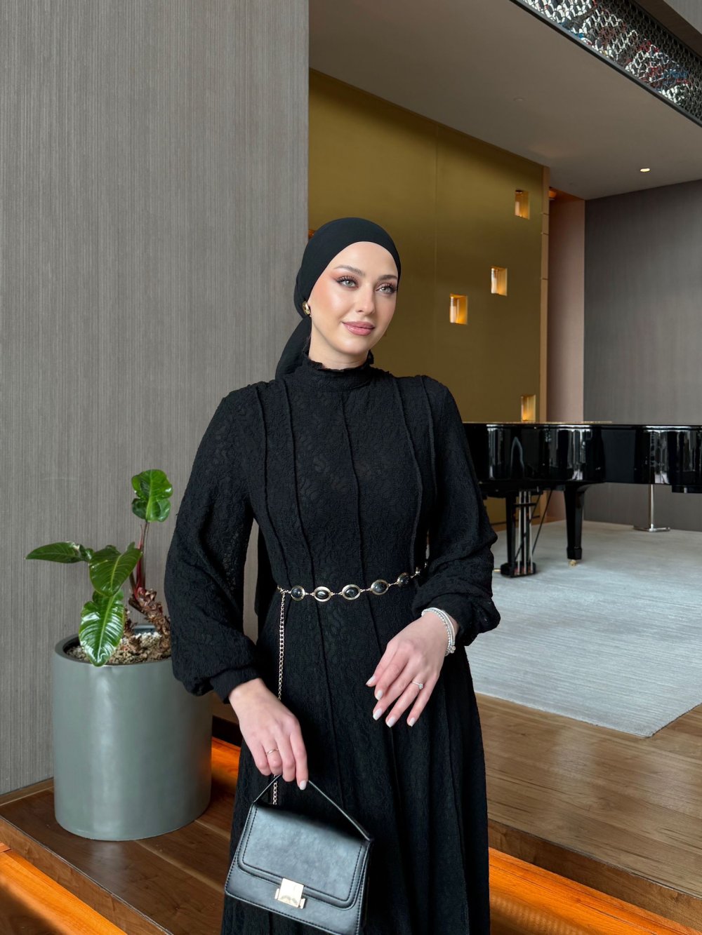 يبرز هذا الفستان الطويل بتصميم أنيق وتفاصيل عصرية، حيث يظهر وقفة مثالية بفضل قماش الترينش المتين والمرن في الوقت نفسه. تضيف التفاصيل المطوية في المقدمة حركة للتصميم، بينما يؤكد خط الخصر مع الحزام على منحنيات الجسم بأناقة. بطوله الكامل وتصميمه البسيط، يقدم خياراً أنيقاً للمناسبات الخاصة وللستايل الحضري.