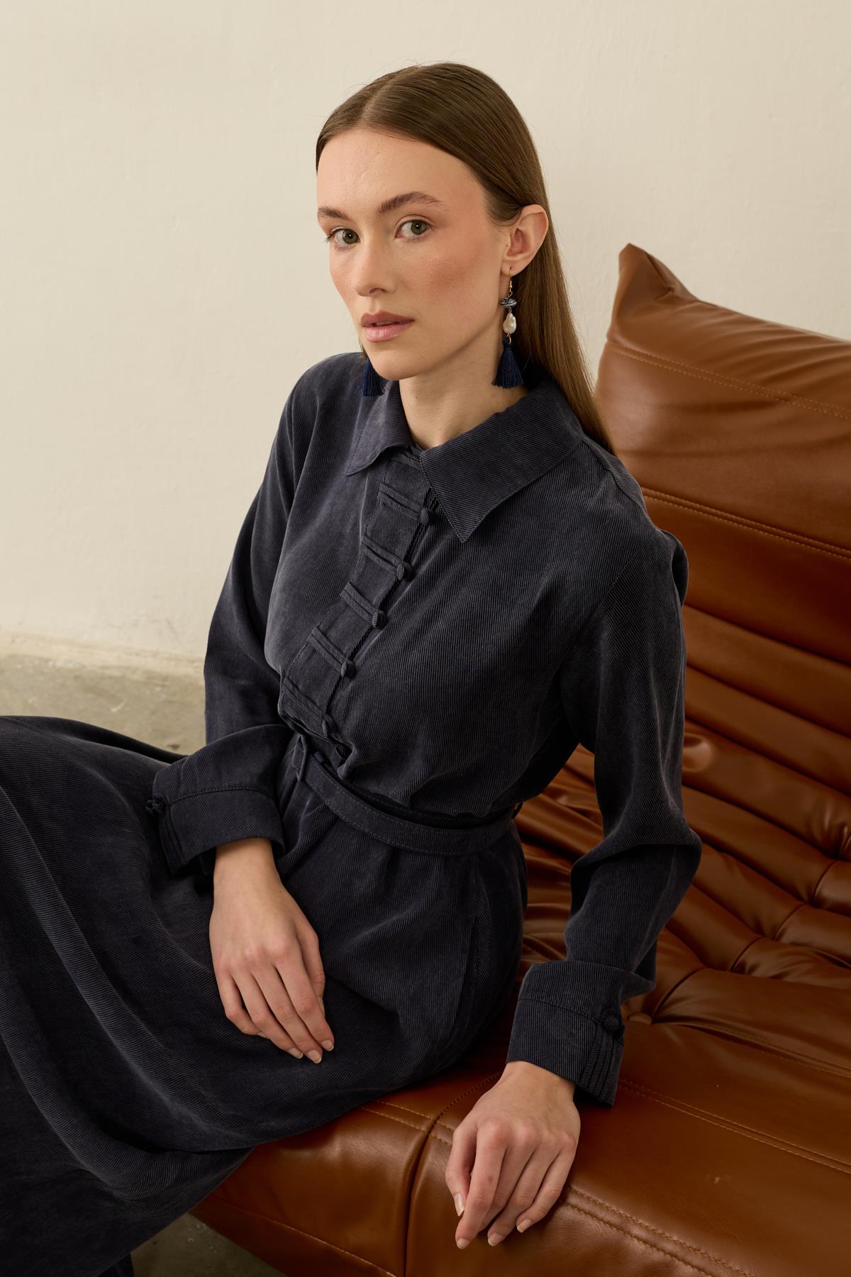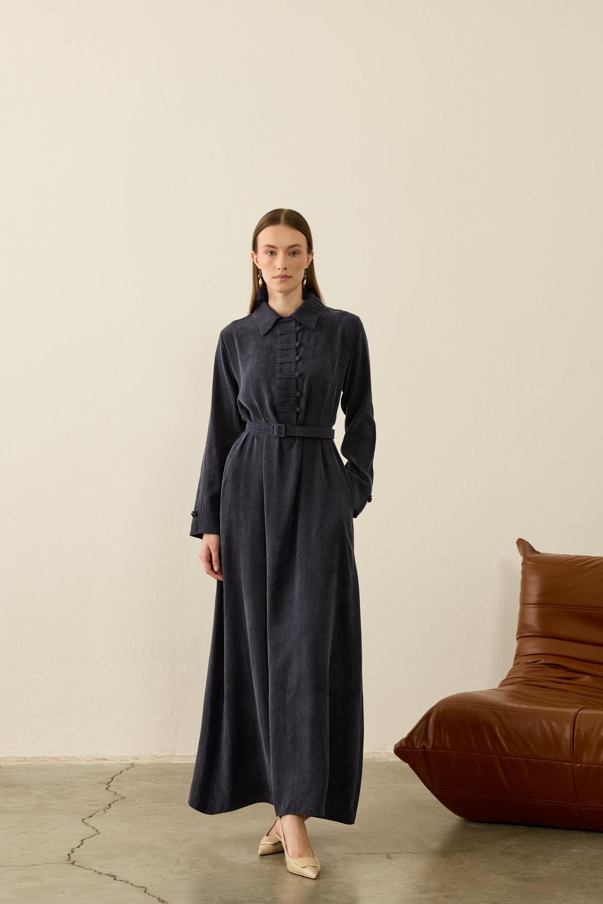 فستان إيموش بريتلي مع أزرار وحزام – أزرق داكن