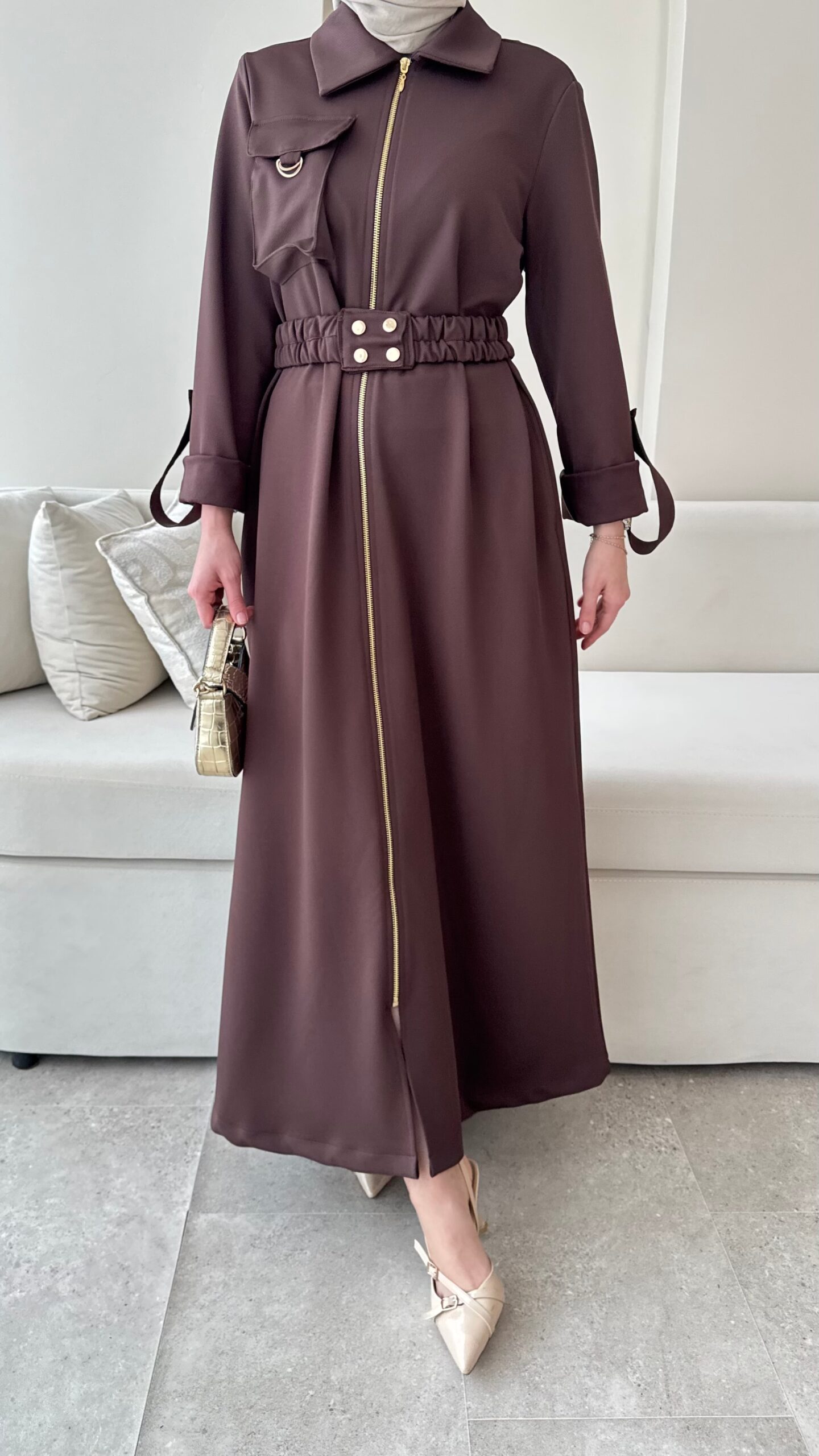 يبرز هذا الفستان الطويل بتصميم أنيق وتفاصيل عصرية، حيث يظهر وقفة مثالية بفضل قماش الترينش المتين والمرن في الوقت نفسه. تضيف التفاصيل المطوية في المقدمة حركة للتصميم، بينما يؤكد خط الخصر مع الحزام على منحنيات الجسم بأناقة. بطوله الكامل وتصميمه البسيط، يقدم خياراً أنيقاً للمناسبات الخاصة وللستايل الحضري.