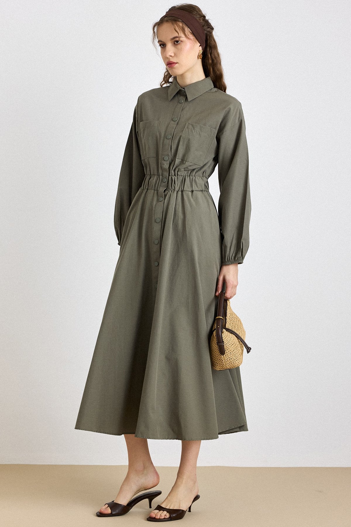 فستان البوبلين الخاكي 9286-E بجيب صدر وخصر مطاطي