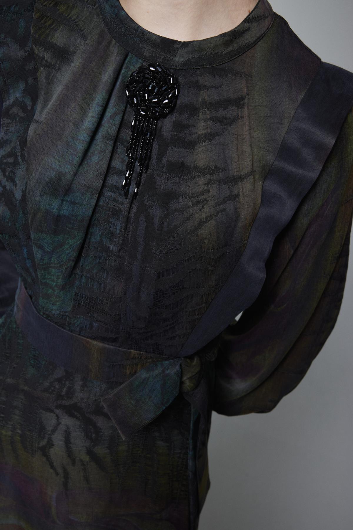 تفاصيل المنتج: ياقة مستديرة، أكمام طويلة، مزود بحزام، تصميم متدفق، قماش مزخرف