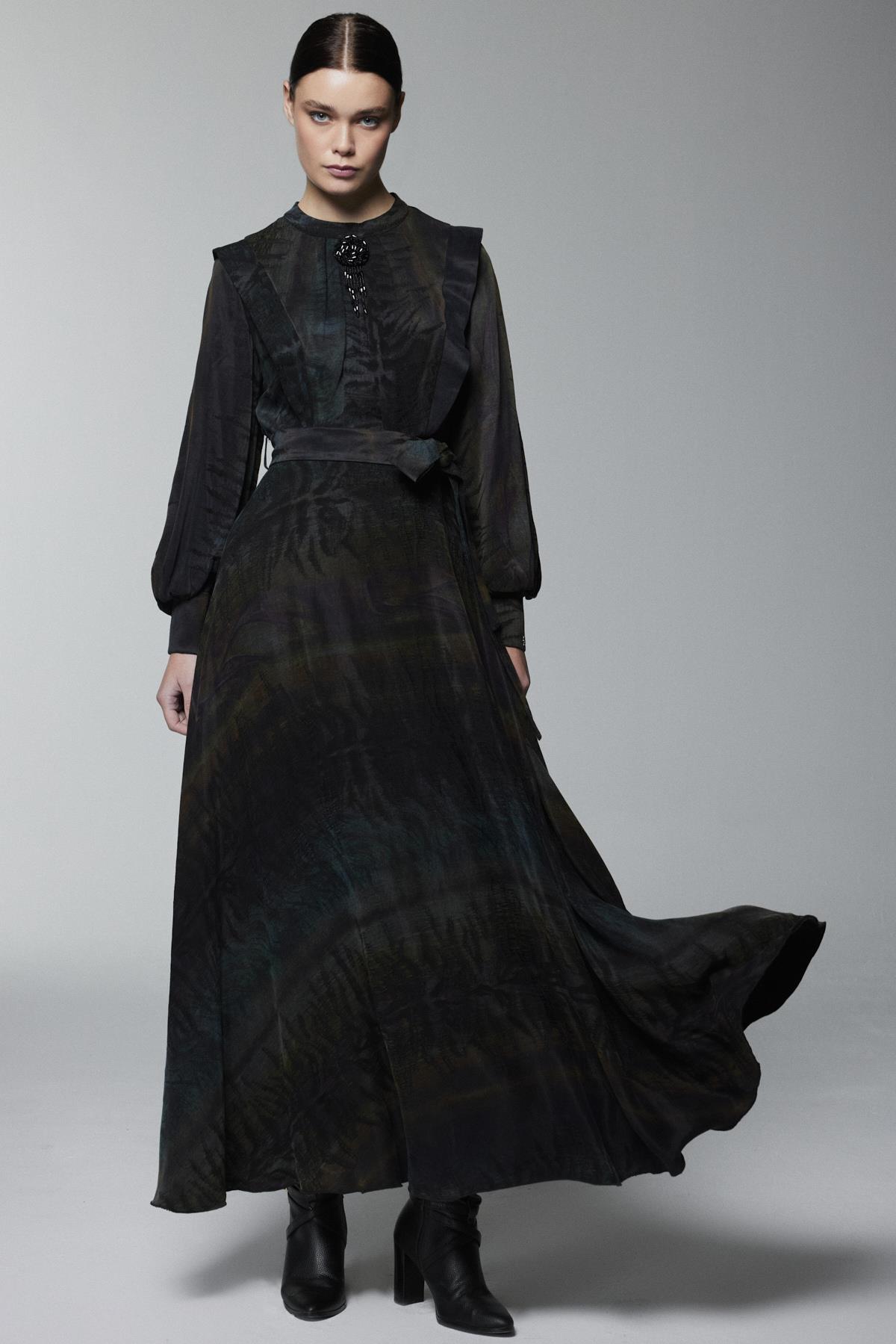 يتميز هذا الفستان بتصميم الطاووس بألوان طبيعية وقماش متدفق، مما يمنحكِ قواماً متناسقاً وأنيقاً مع تفصيل الحزام عند الخصر. يمكنكِ ارتداؤه براحة في المناسبات اليومية والخاصة على حد سواء.