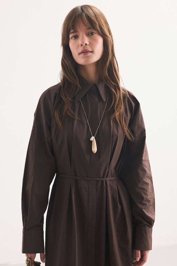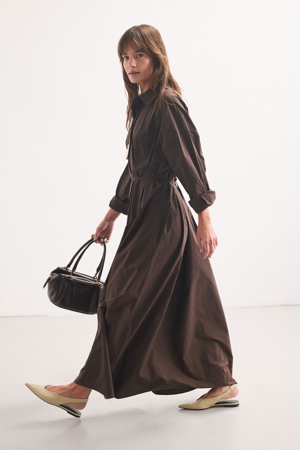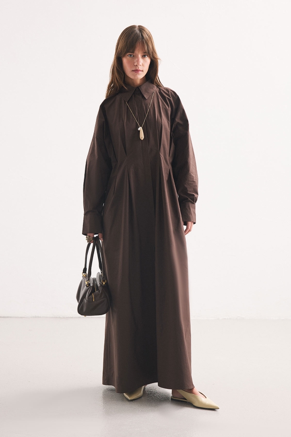 فستان القميص باللون القهوي مع تفاصيل الطيات