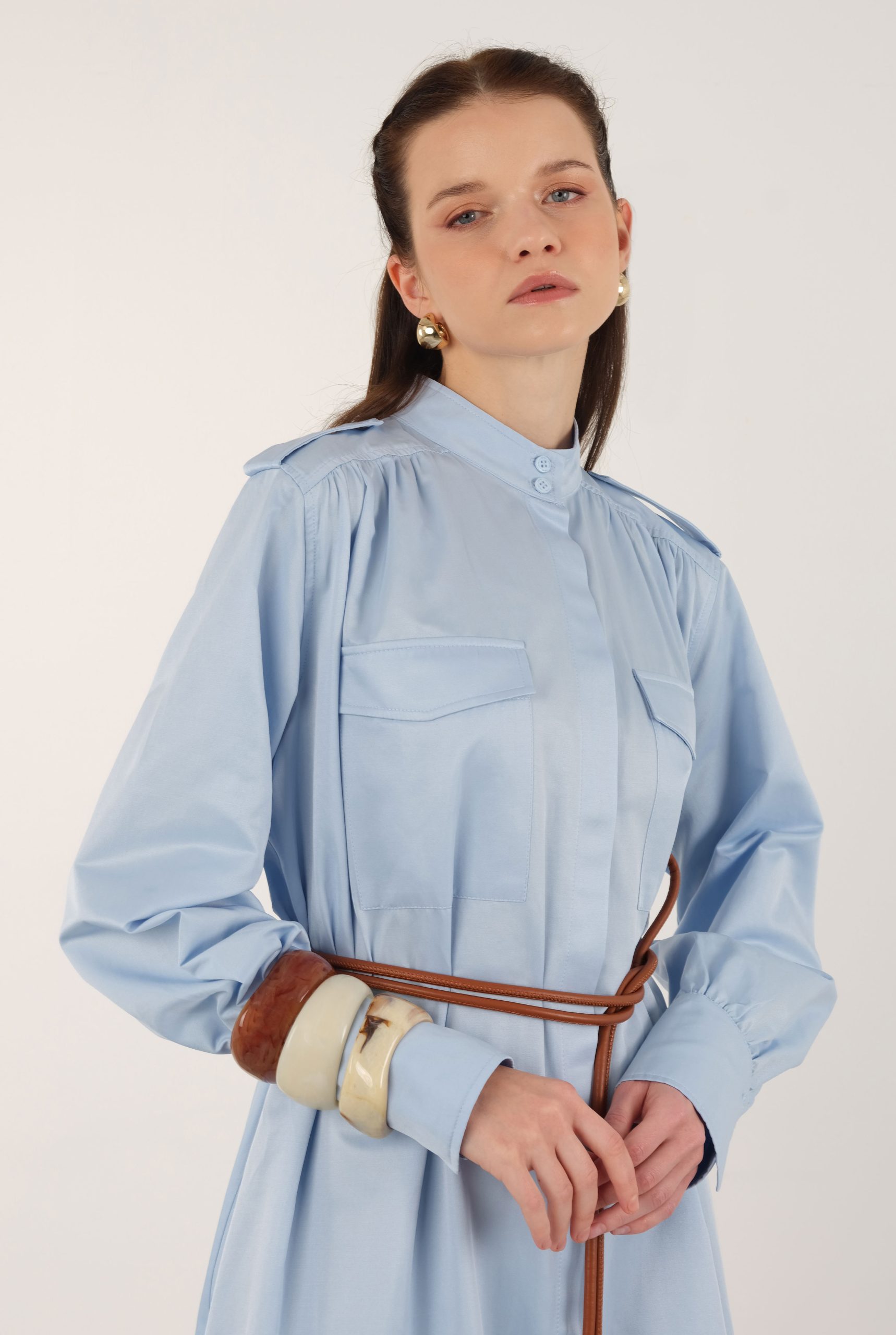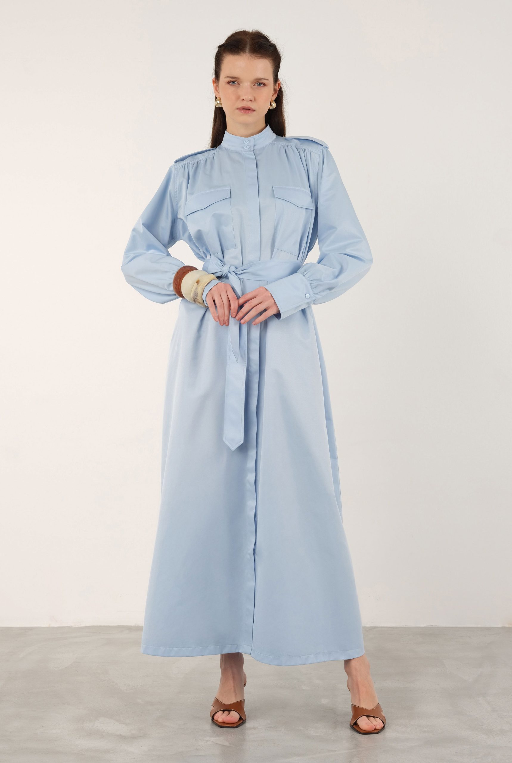 فستان الكتفين المزين بالشراشيب الأزرق الفاتح