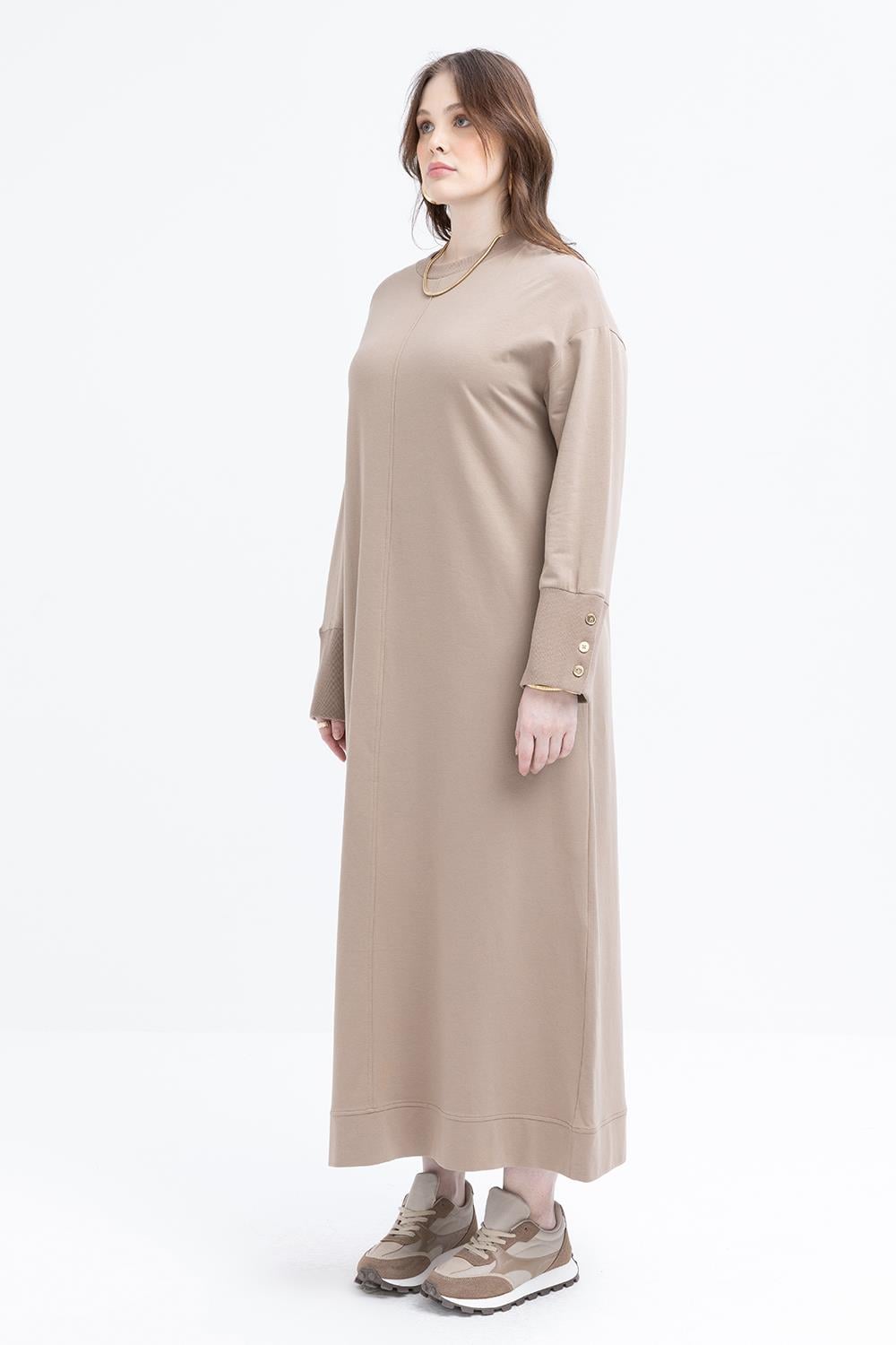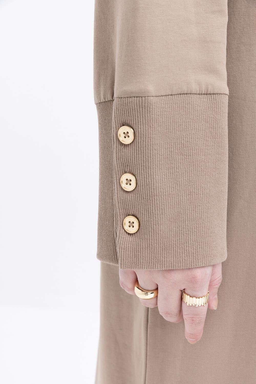 فستان بتفاصيل أزرار وضلوع سميكة وأكمام من فرو المنك