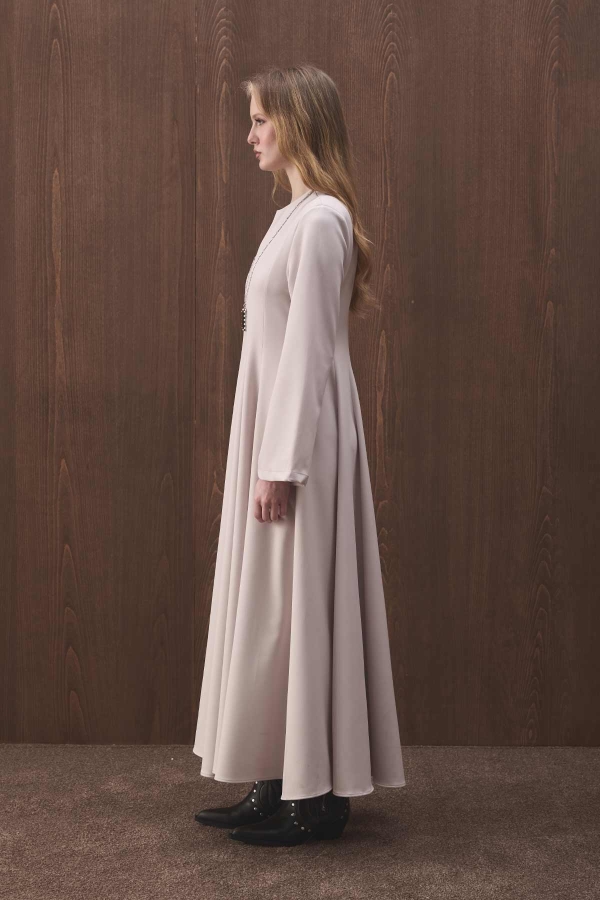 يبرز هذا الفستان الطويل بتصميم أنيق وتفاصيل عصرية، حيث يظهر وقفة مثالية بفضل قماش الترينش المتين والمرن في الوقت نفسه. تضيف التفاصيل المطوية في المقدمة حركة للتصميم، بينما يؤكد خط الخصر مع الحزام على منحنيات الجسم بأناقة. بطوله الكامل وتصميمه البسيط، يقدم خياراً أنيقاً للمناسبات الخاصة وللستايل الحضري.