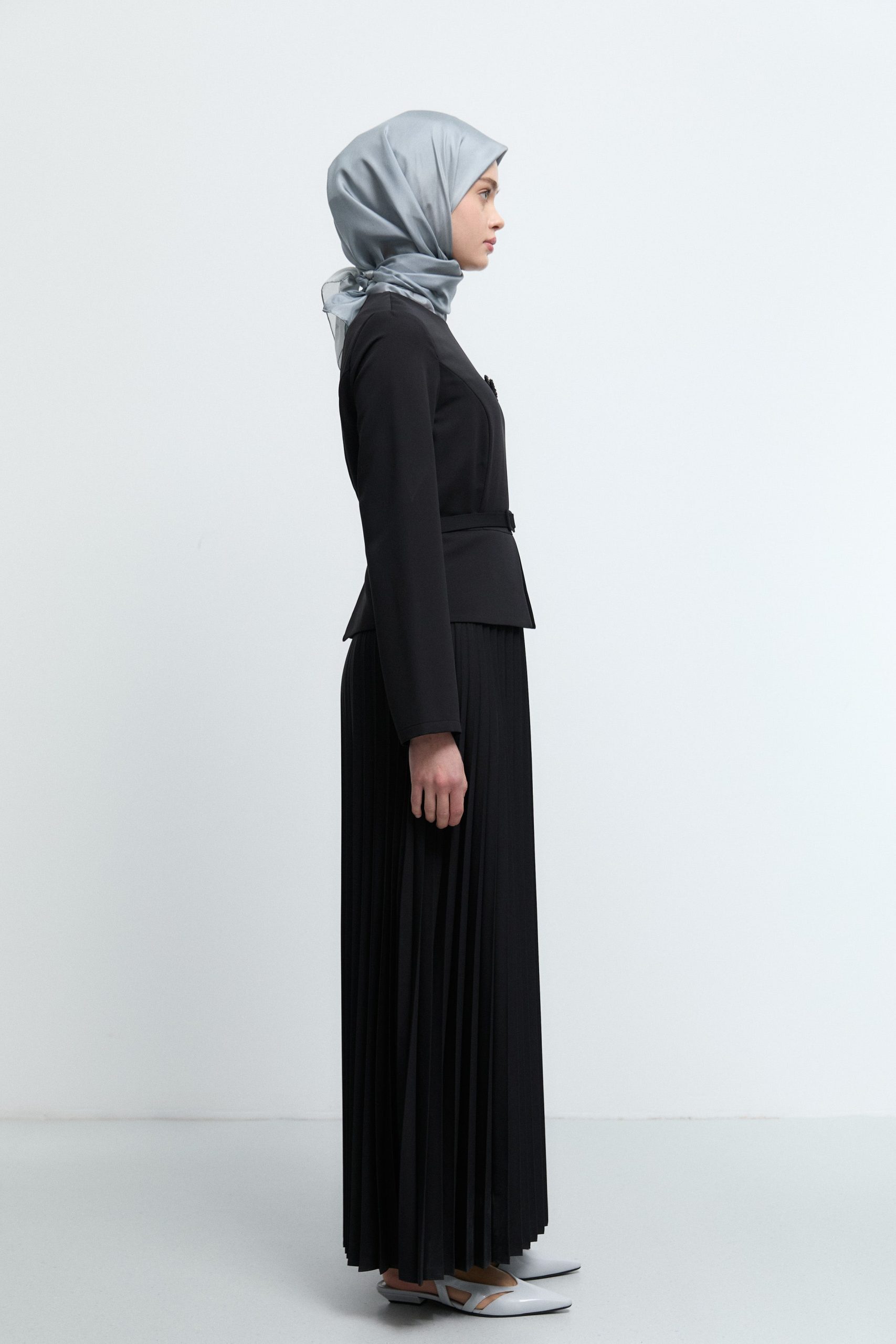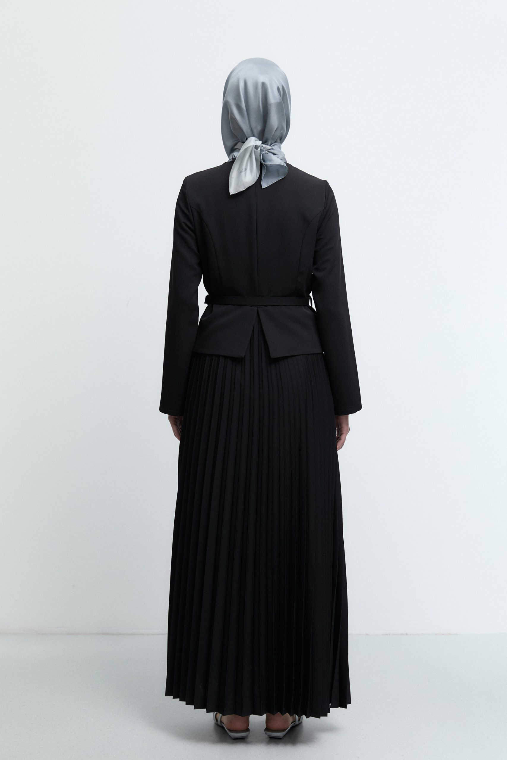 التفاصيل: خصر مع حزام، تفاصيل مطوية في المقدمة، أكمام طويلة مع كفة