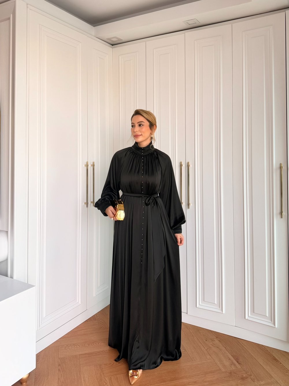 يتم إغلاق الفستان بأزرار من الخلف عند الرقبة.