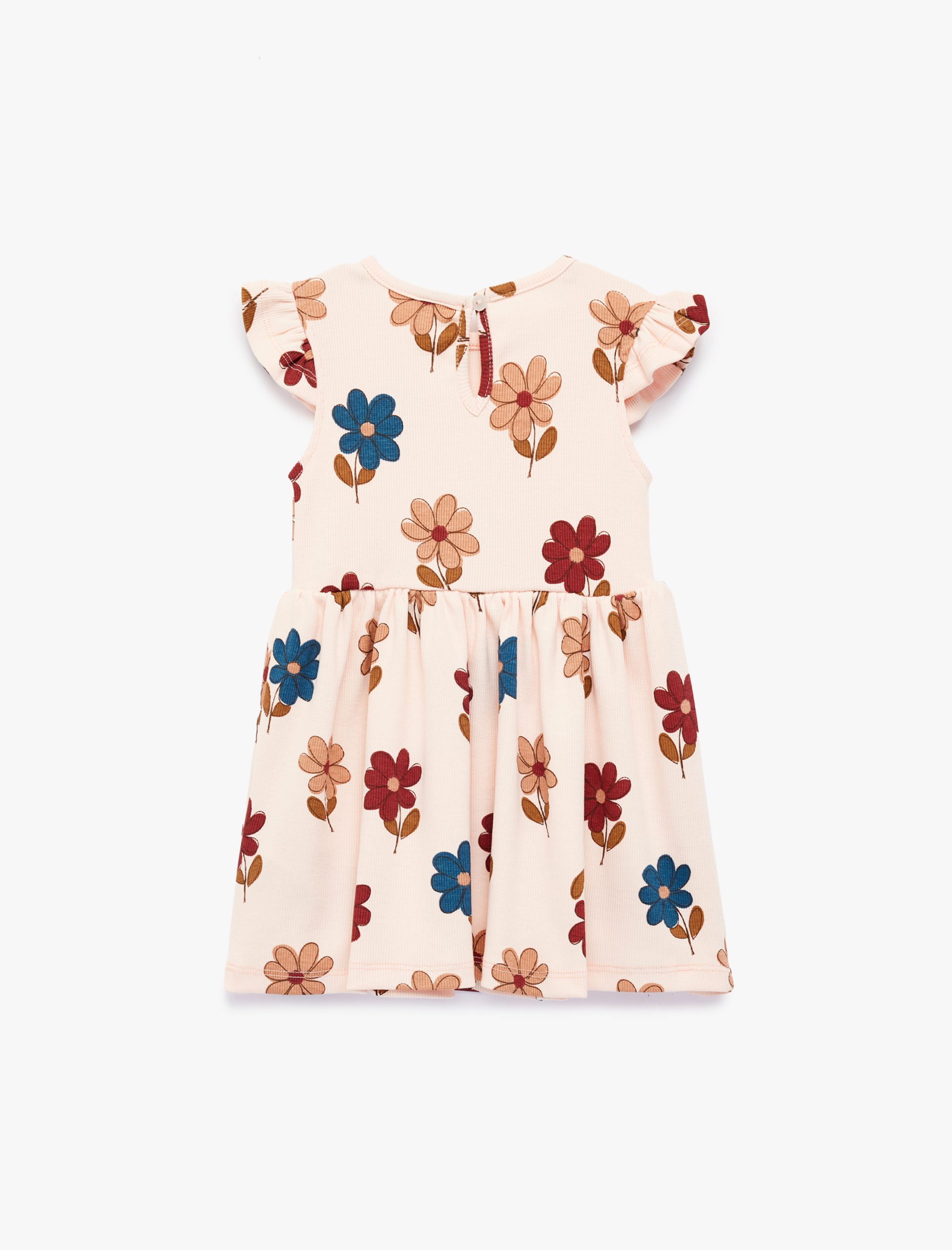 فستان بناتي بلا أكمام بتصميم ياقة الدراجة وقطن وتفاصيل كشكشة وطباعة زهور