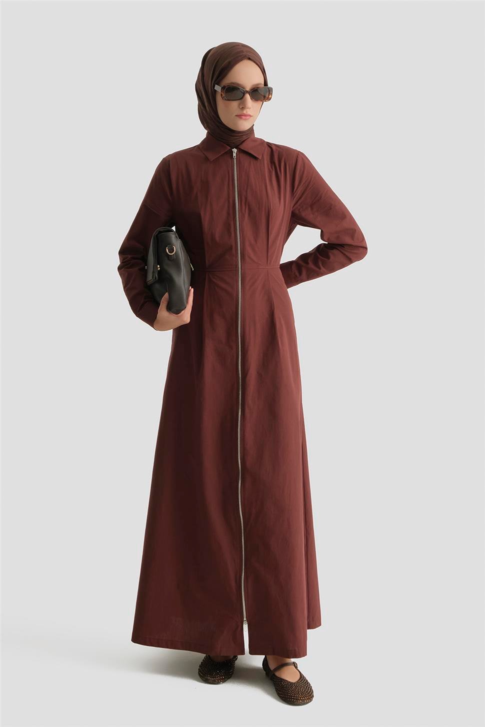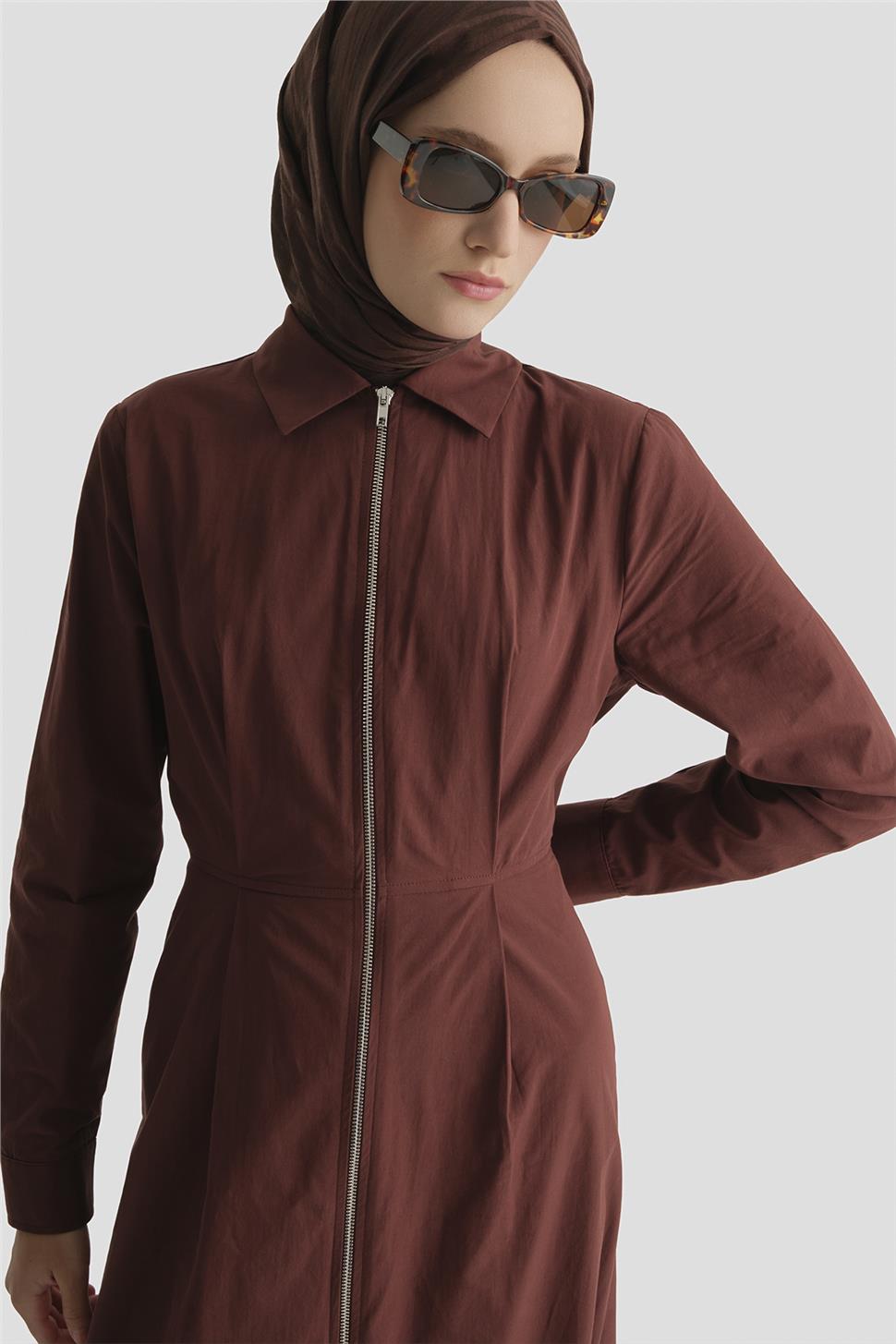 فستان بني متماسك بتفاصيل سحاب