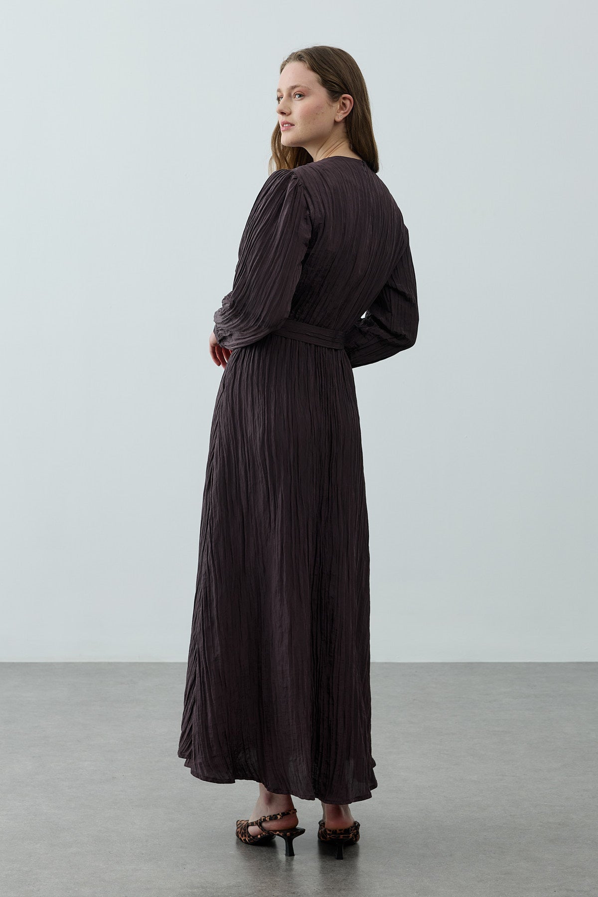فستان طويل مصنوع من قماش منسوج خفيف الوزن ومتموج بلمعة خفيفة. يتميز بخط عنق مستدير، إغلاق بسحاب من الخلف، أكمام بالون طويلة، حزام مطاطي عند الخصر، وحزام من نفس القماش المتموج.