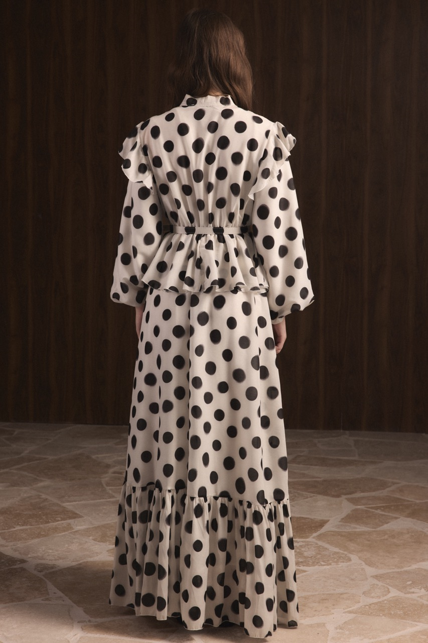 يتميز هذا الفستان الأنيق باللون البيج بتصميم تنورة منقطة مرحة مع كشكشات رقيقة، مما يخلق مظهرًا ساحرًا وأنيقًا مثاليًا لأي مناسبة. تصميم السيولة والتفاصيل الأنثوية يجعله إضافة متعددة الاستخدامات إلى خزانة ملابسك.