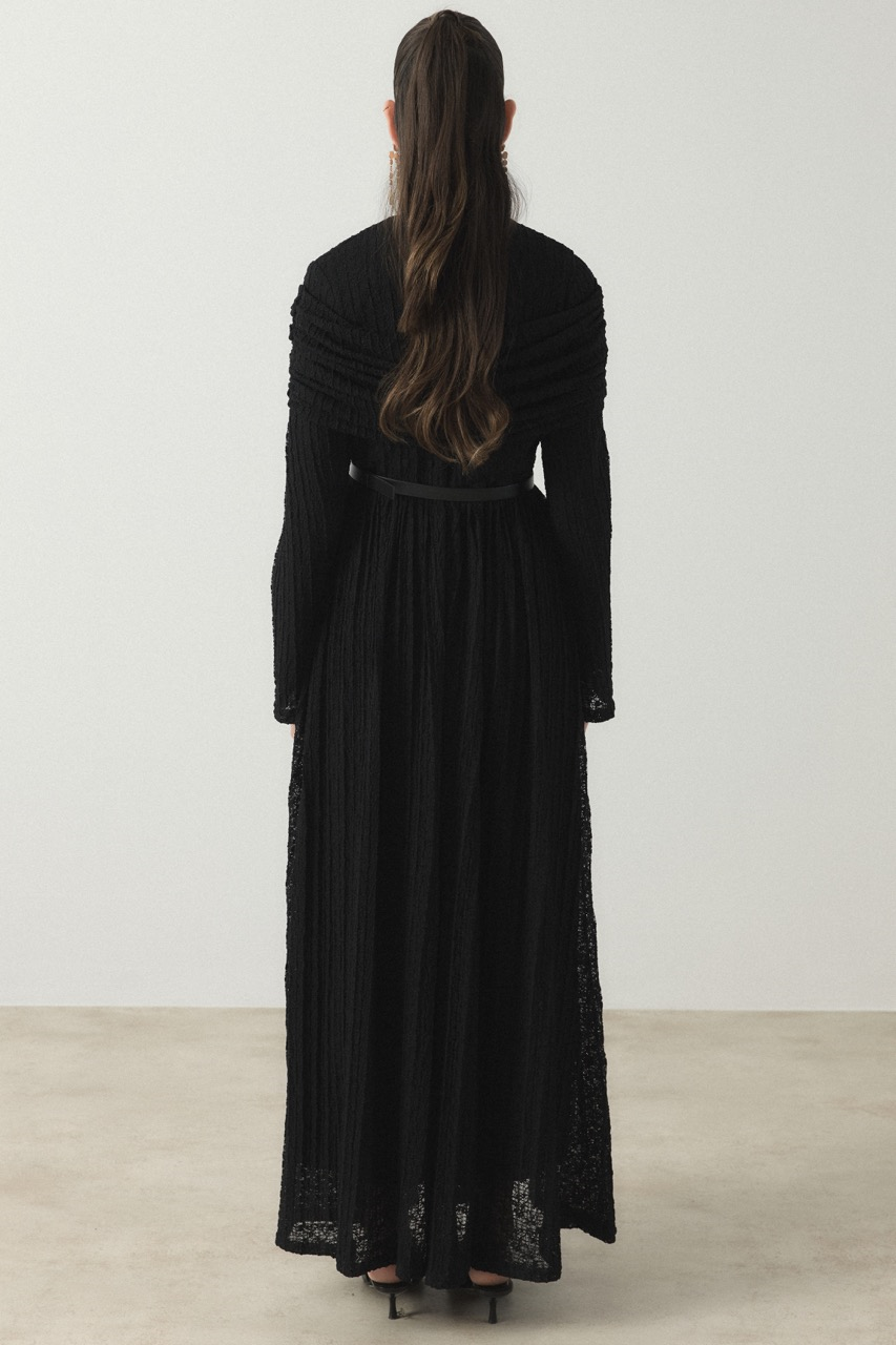 فستان أسود أنيق بتصميم دانتيل وتور رقيق مع تفاصيل مموجة أنيقة على الكتفين. مثالي للمناسبات الخاصة، يجمع هذا الفستان بين الأناقة الخالدة واللمسة العصرية.