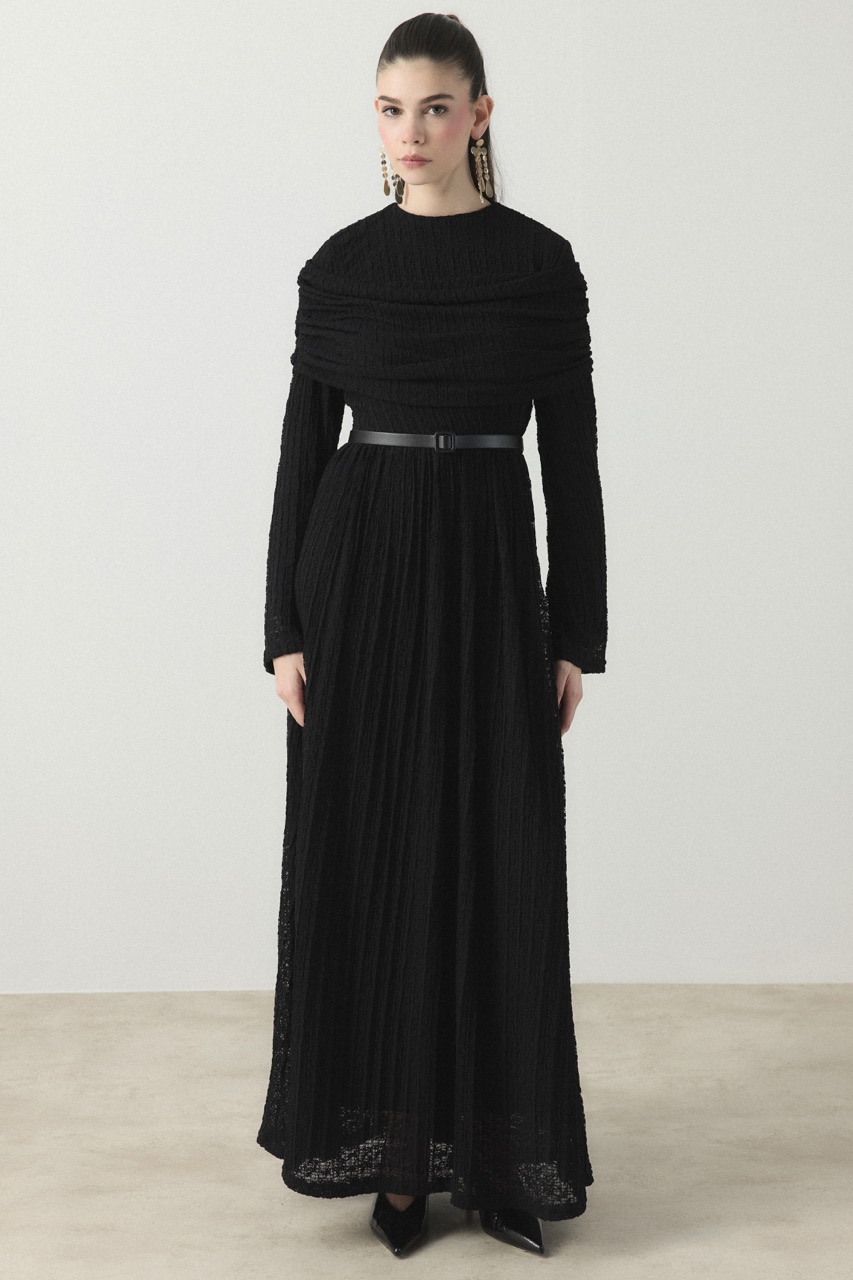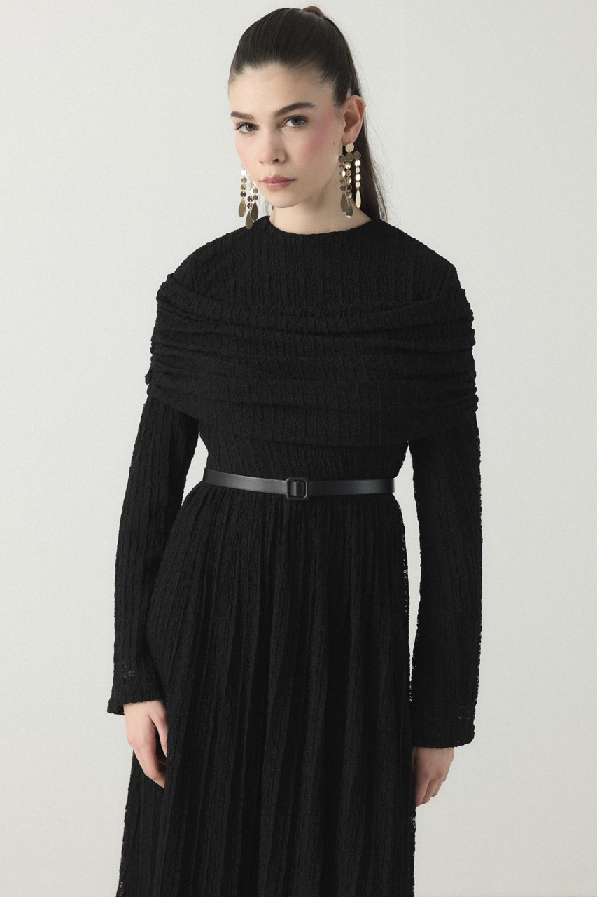 فستان تور دانتيل بتفاصيل كتف مموجة – أسود