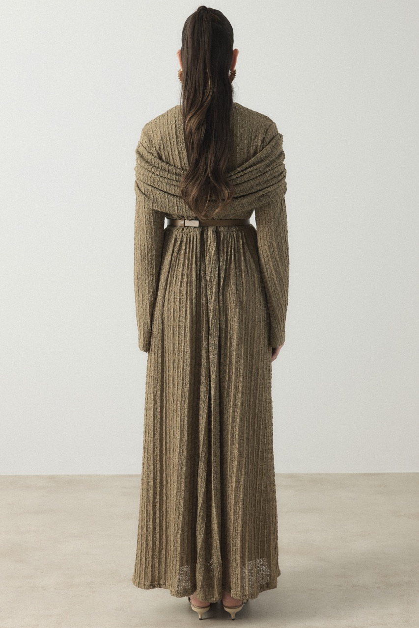 فستان أنيق من تول الدانتيل مع كشكش رقيق على الكتفين بلون أخضر زيتوني راقي. مثالي للمناسبات الخاصة، يجمع هذا الفستان بين الأناقة الخالدة واللمسة العصرية.