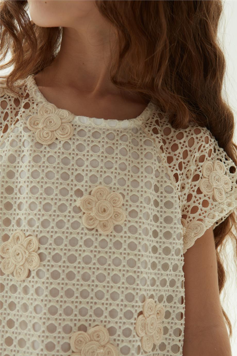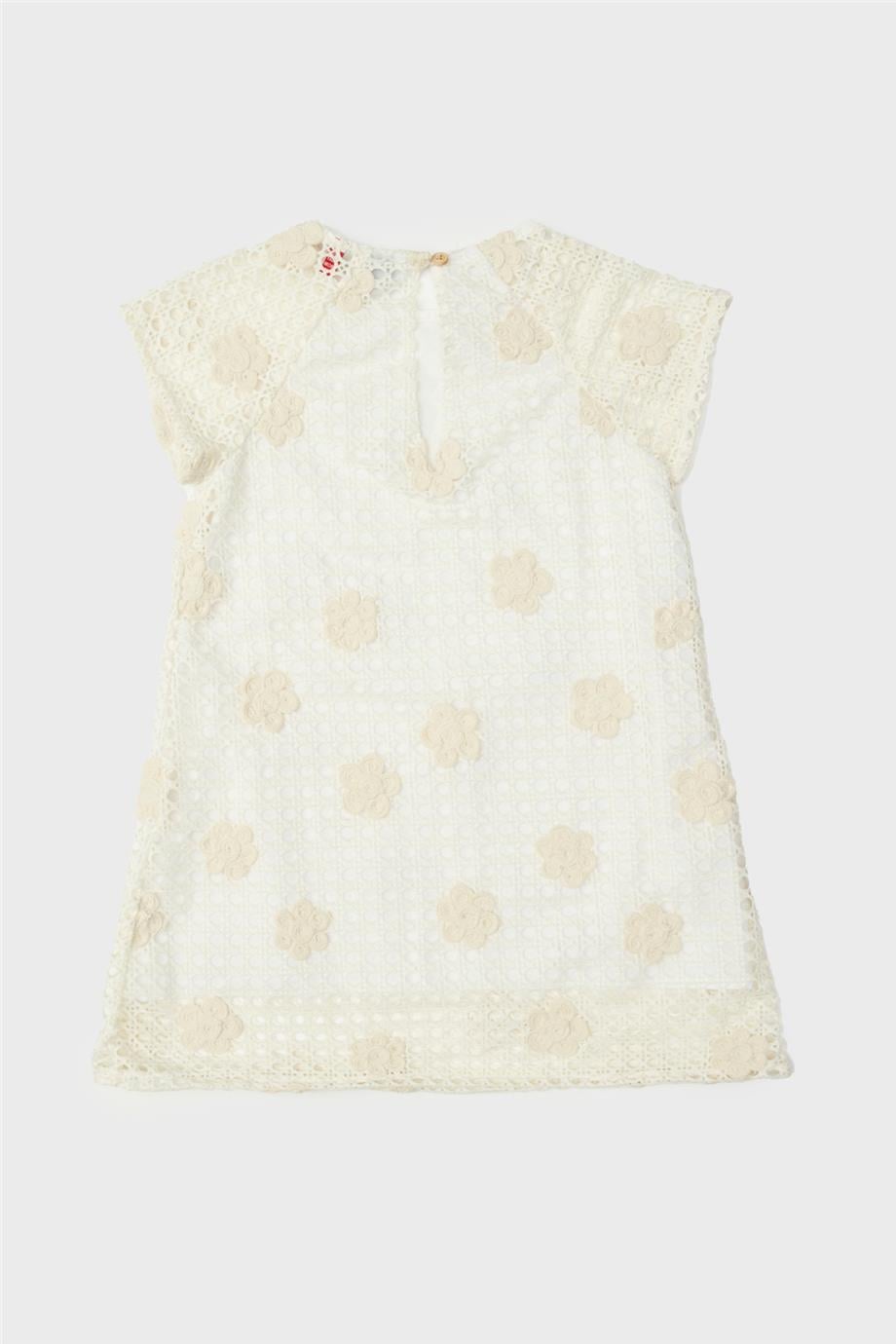 فستان للبنات بلون الكريمة – 100% بوليستر – الياقة: ياقة دائرية، الأكمام: قصيرة، القص: واسع، القماش: شبكي، البطانة: مبطن، تفاصيل الإغلاق: بأزرار، الجيب: بدون جيوب