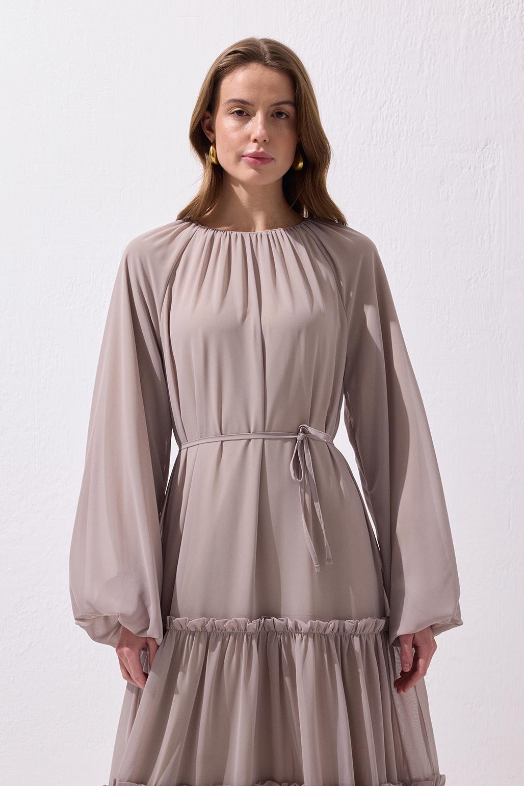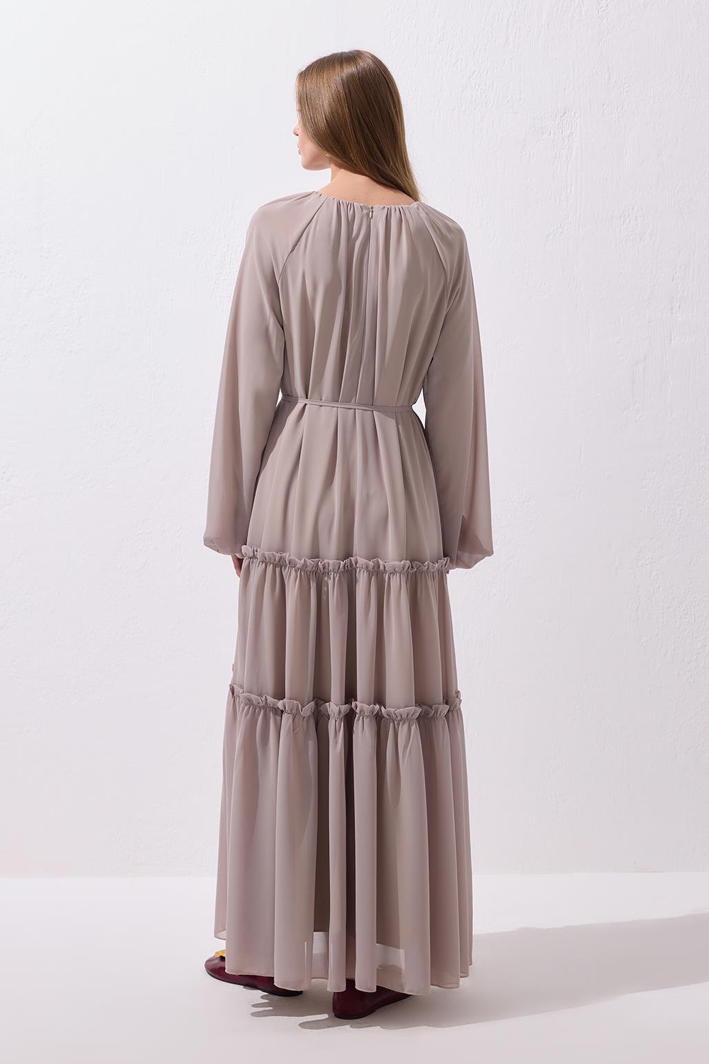 فستان جولي الطويل بلون الفيزون، مصنوع من قماش الشيفون متعدد الطبقات، ويوفر راحة طوال اليوم بفضل خفته وقدرته على التنفس. يضيف تصميم الياقة المدورة وتفاصيل الطيات أناقة بسيطة وجميلة. القص المتعدد الطبقات يمنحك حرية الحركة، بينما تضيف الأكمام المنفوخة المبطنة لمسة أنيقة للفستان. تفصيل الحزام يبرز خصرك بأناقة لخلق مظهر أنثوي جذاب. مثالي لإنشاء إطلالات مثالية لكل من النهار والمساء.