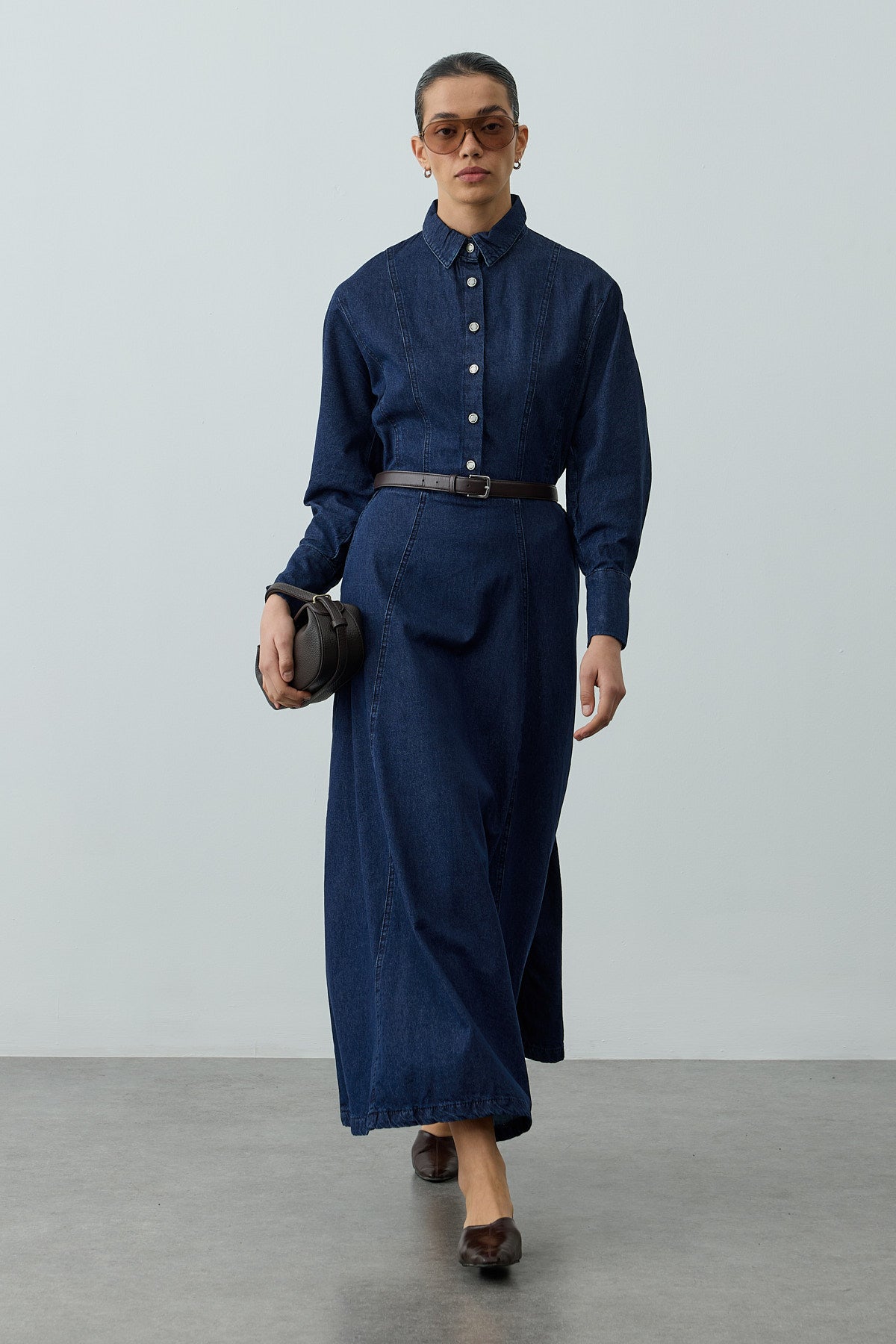 فستان ماكسي مصنوع من قماش الجينز المنسوج، يتميز بقلبة قميص، أكمام طويلة منفوخة مع أصفاد، وإغلاق أمامي بأزرار معدنية.