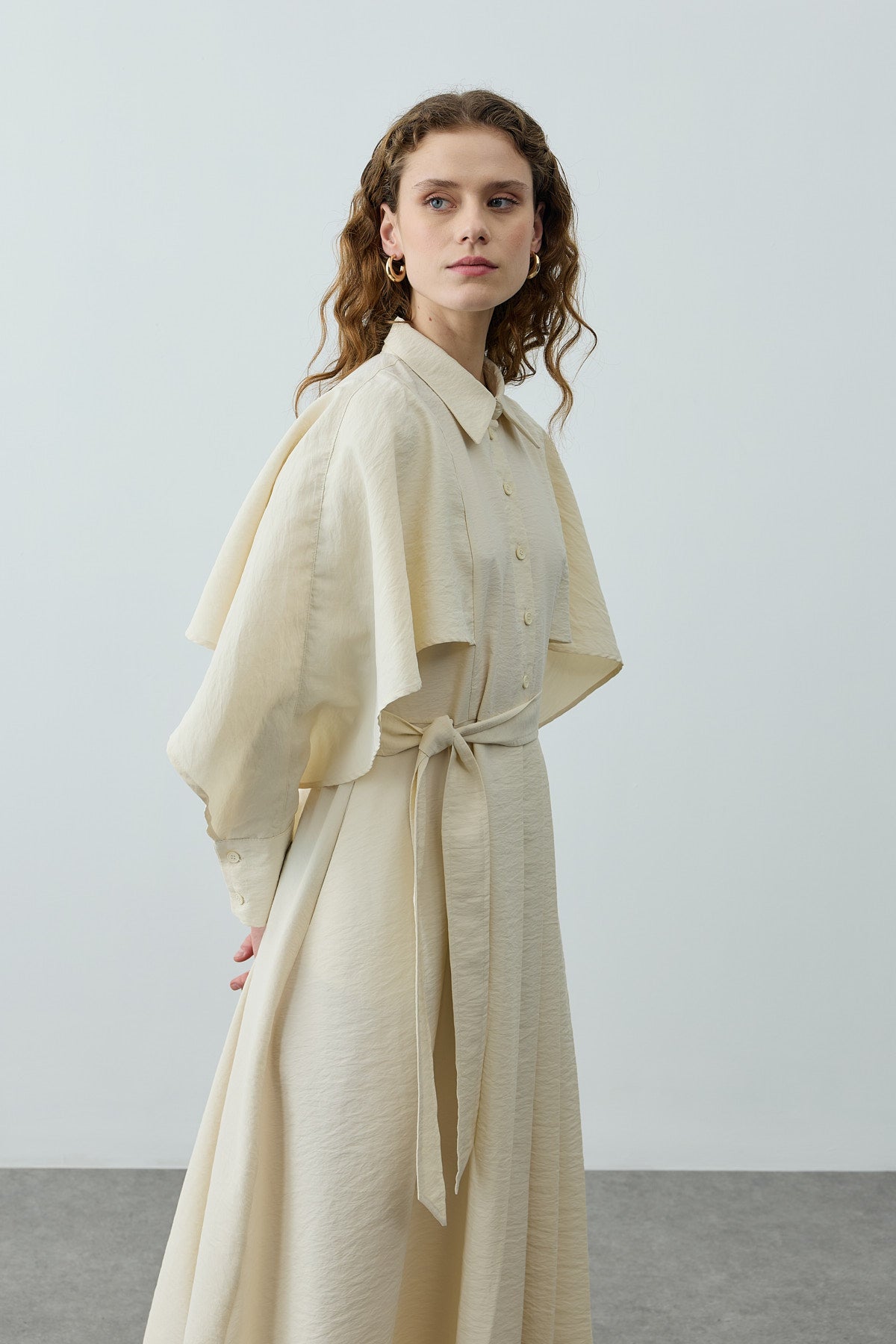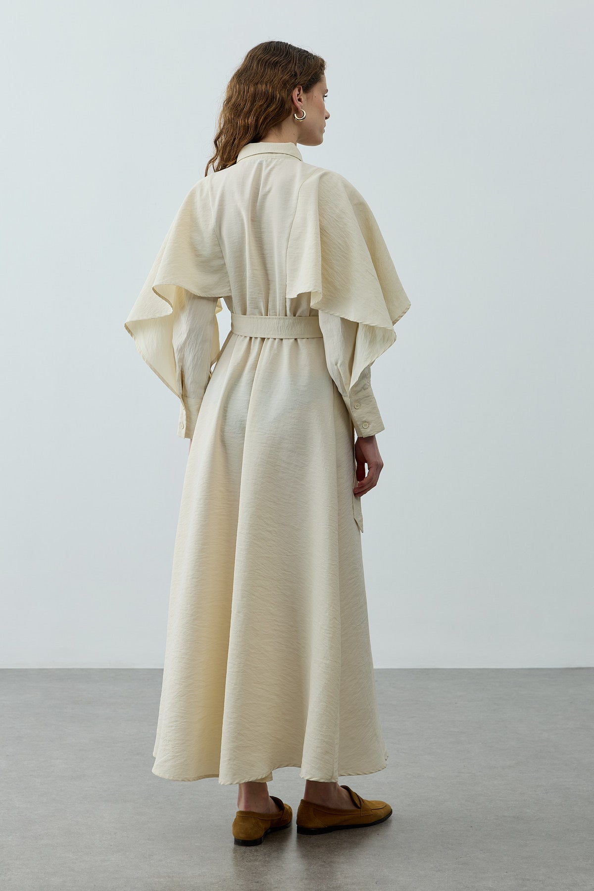 فستان ماكسي مصنوع من قماش منسوج، يتميز بصف ياقة القميص، وواجهة نصفية ذات أزرار، وإغلاق بالأزرار، وأكمام طويلة بأصفاد، وحزام قابل للإزالة، وتفاصيل رداء على الأكمام والكتفين.