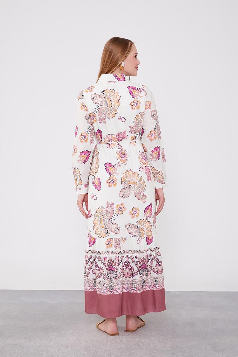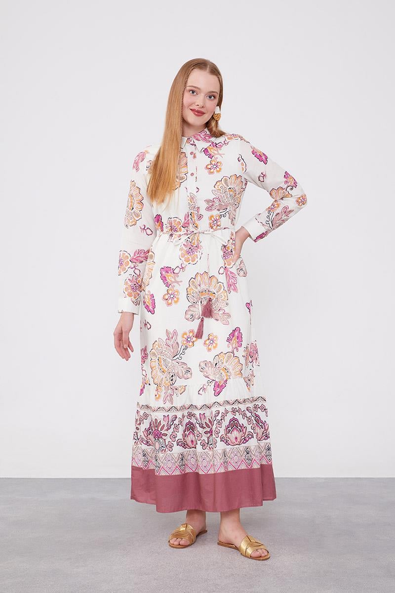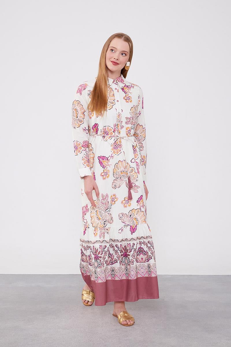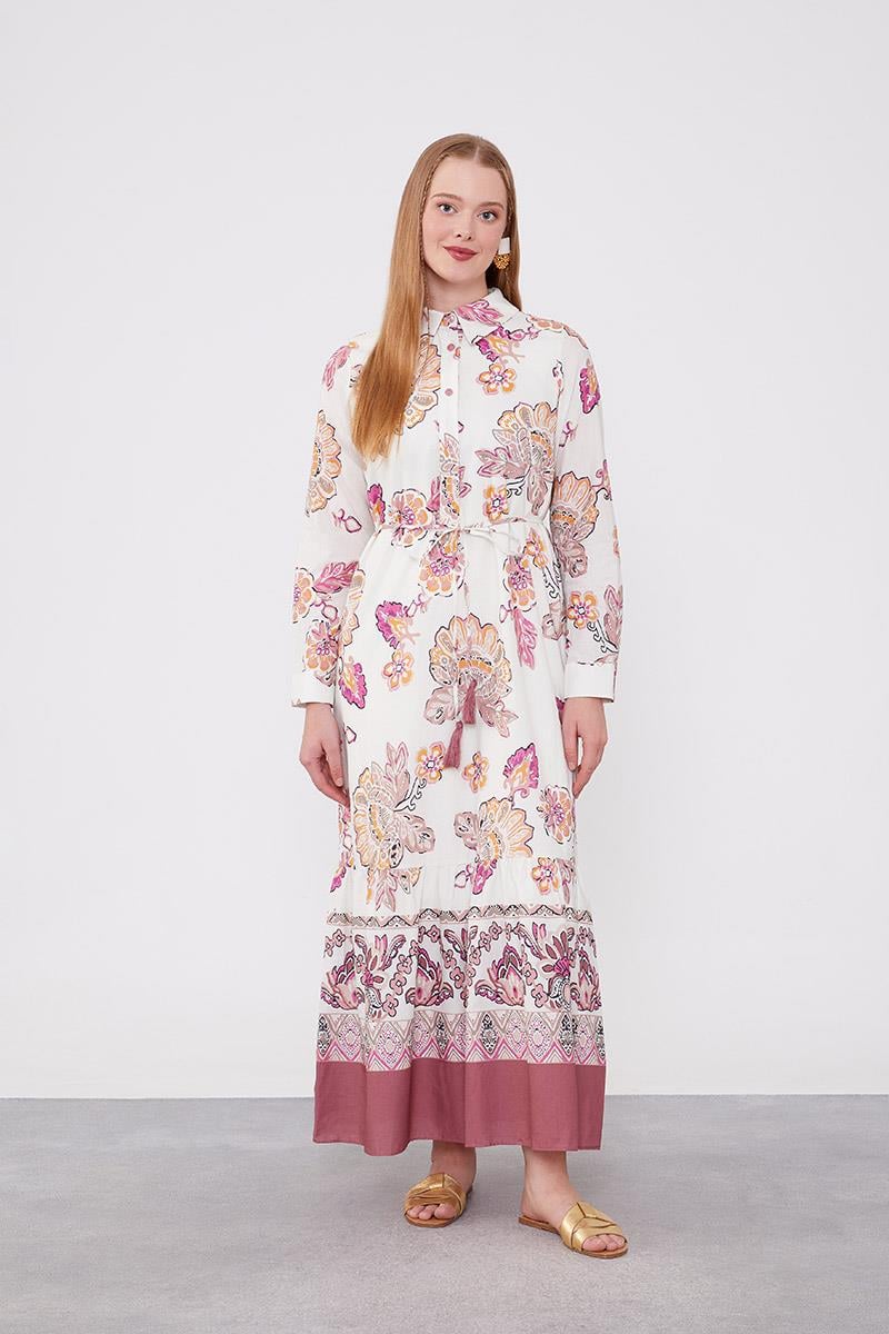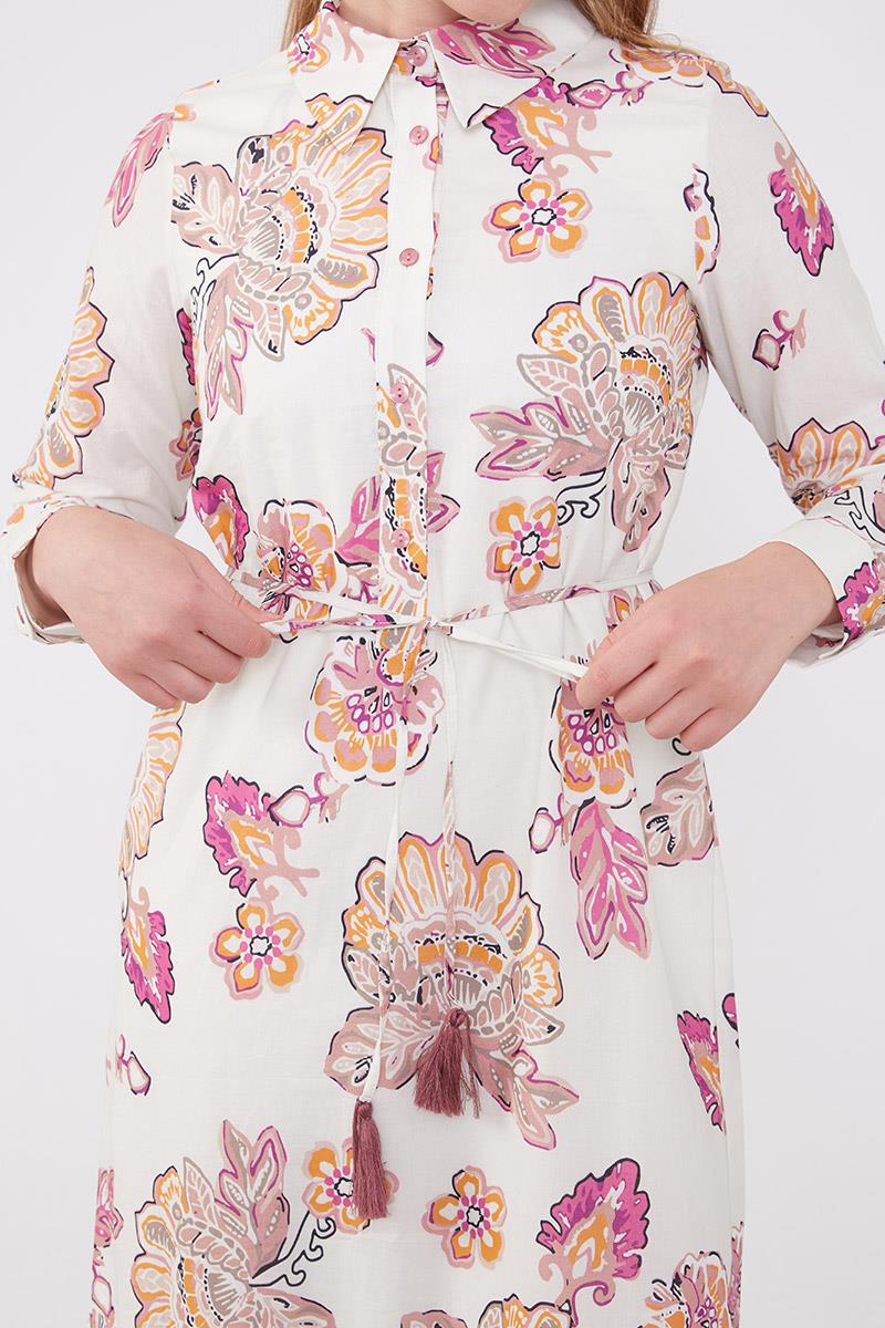 فستان ذو ياقة بتصميم الورد وتفاصيل ربط عند الخصر