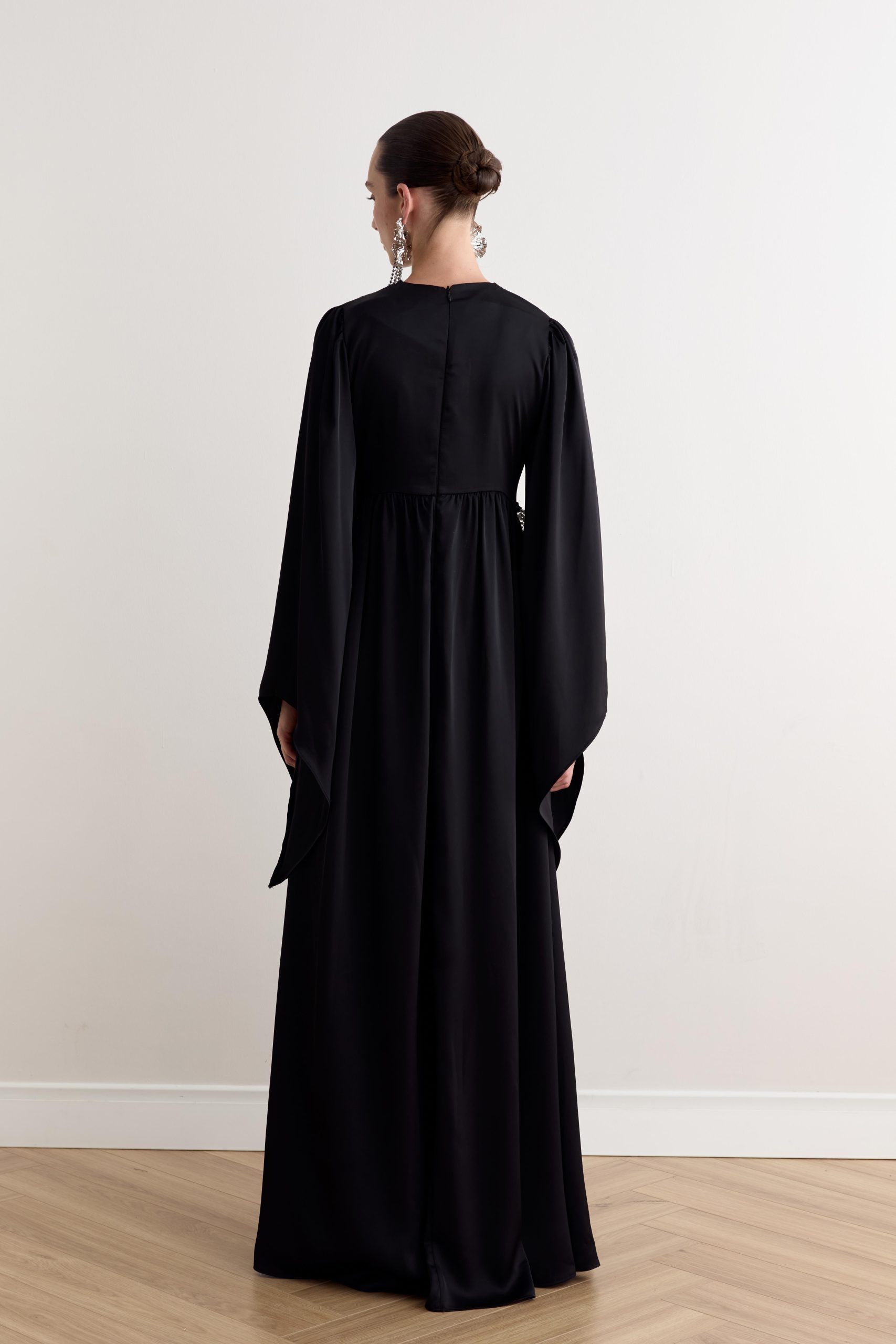 يعرض هذا الفستان المسائي الأنيق هيئة نبيلة بقوام الساتان اللامع، ويعكس الأناقة في أنقى صورها من خلال قصته الرشيقة وحزامه المزين باللؤلؤ. خيار مثالي لمن يبحثون عن مظهر راقٍ في الدعوات والمناسبات الخاصة.