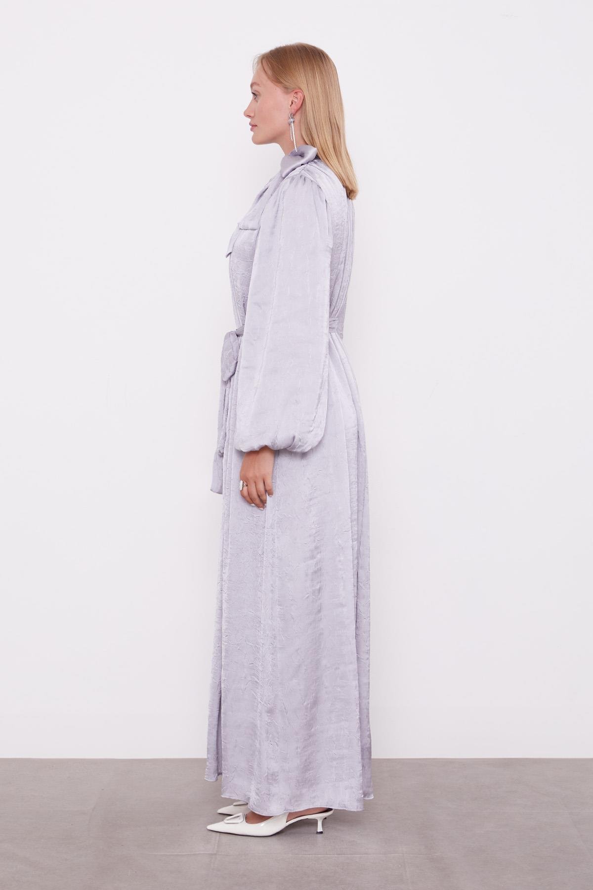فستان ساتان مجعد باللون الرمادي مزود بحزام
