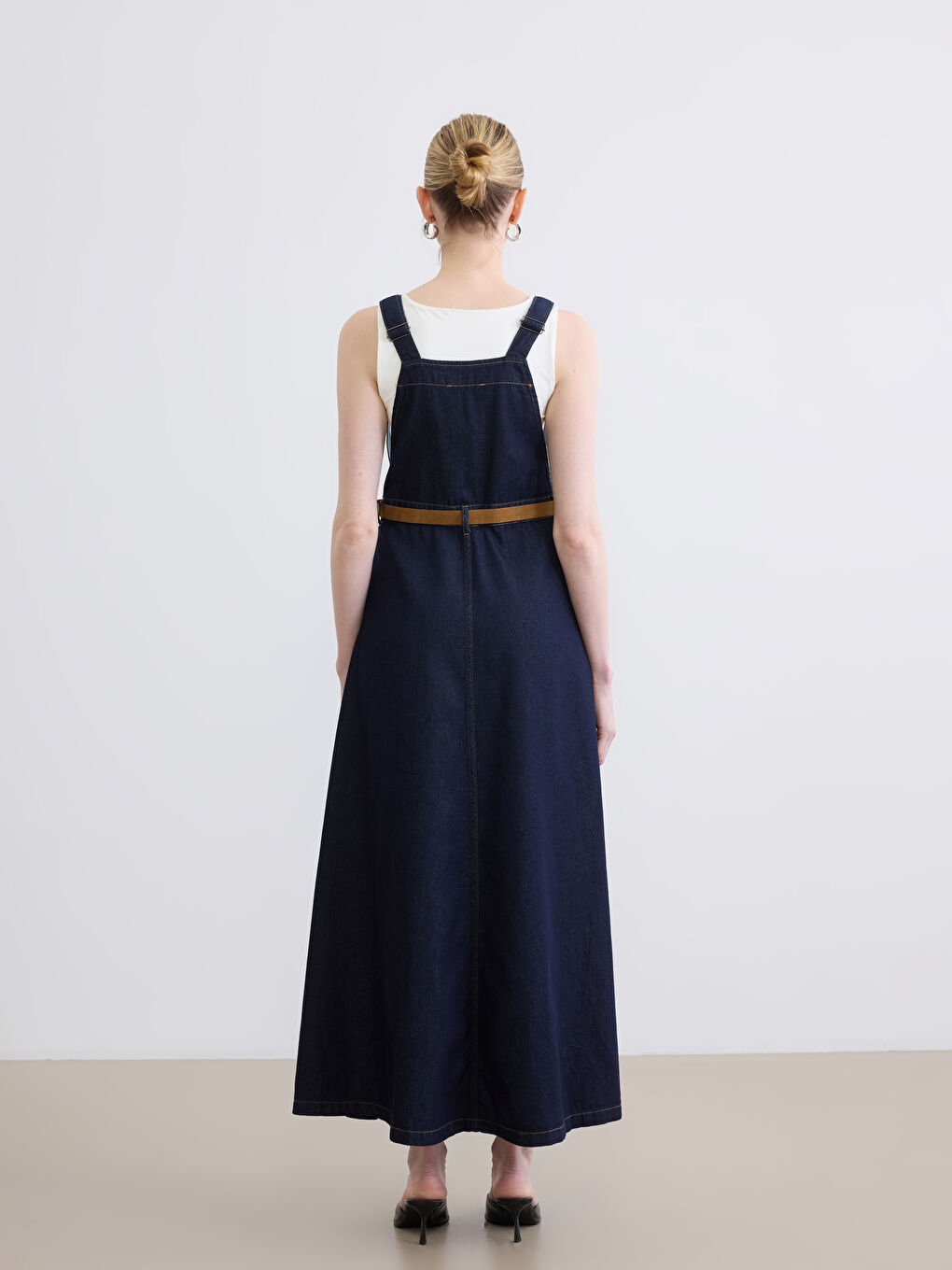فستان سالوبيت جينز أزرق نيلي بحزام عند الخصر ورقبة مربعة