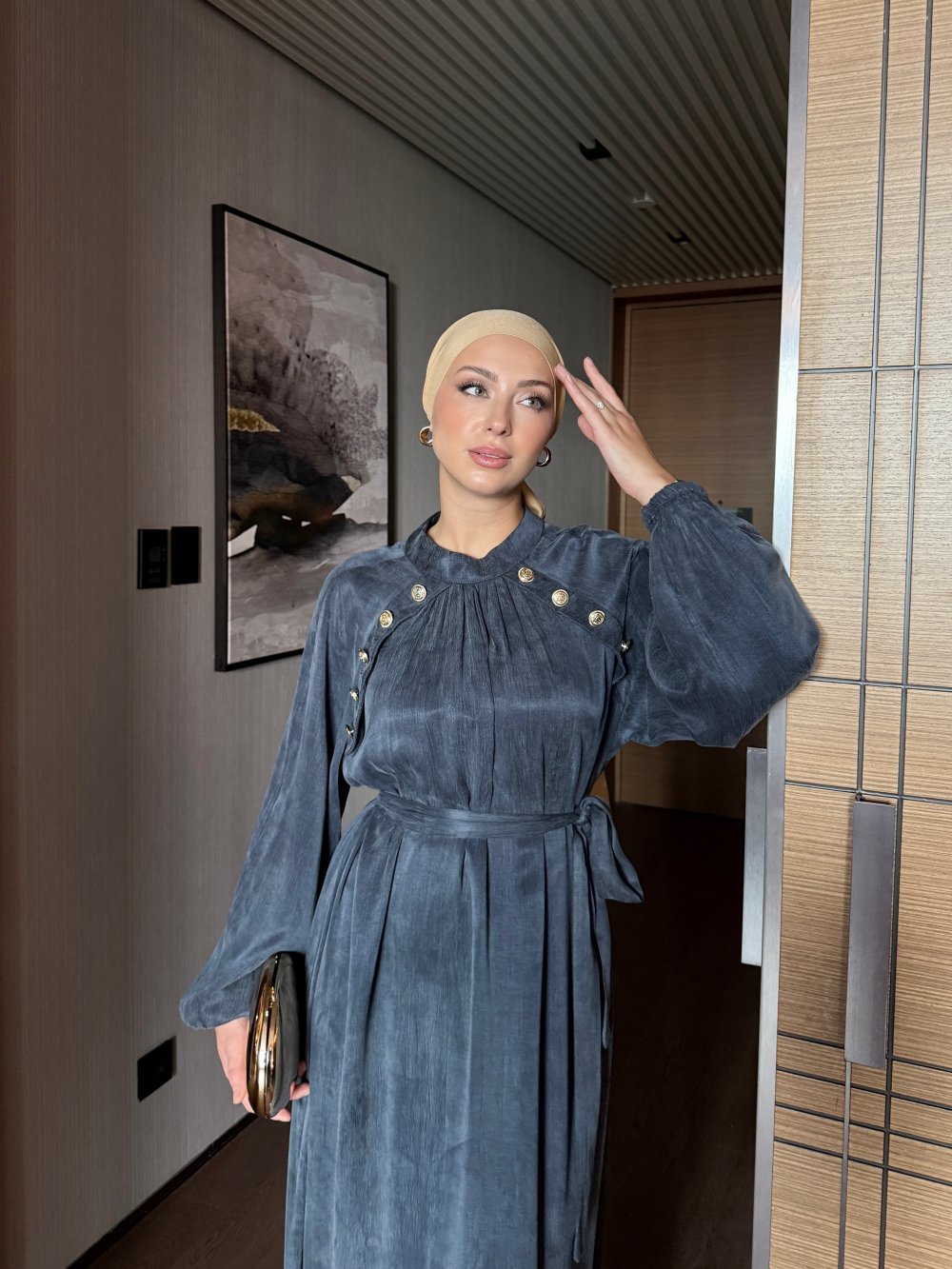 فستان مصنوع من قماش كوبرا حريري من الدرجة الأولى. يتميز بإغلاق بسحاب من الخلف، تصميم بأكتاف منخفضة، أكمام مطاطية، تفاصيل بأزرار ذهبية، حزام قابل للفصل. القياسات: الطول 145 سم، محيط الصدر 60 سم.