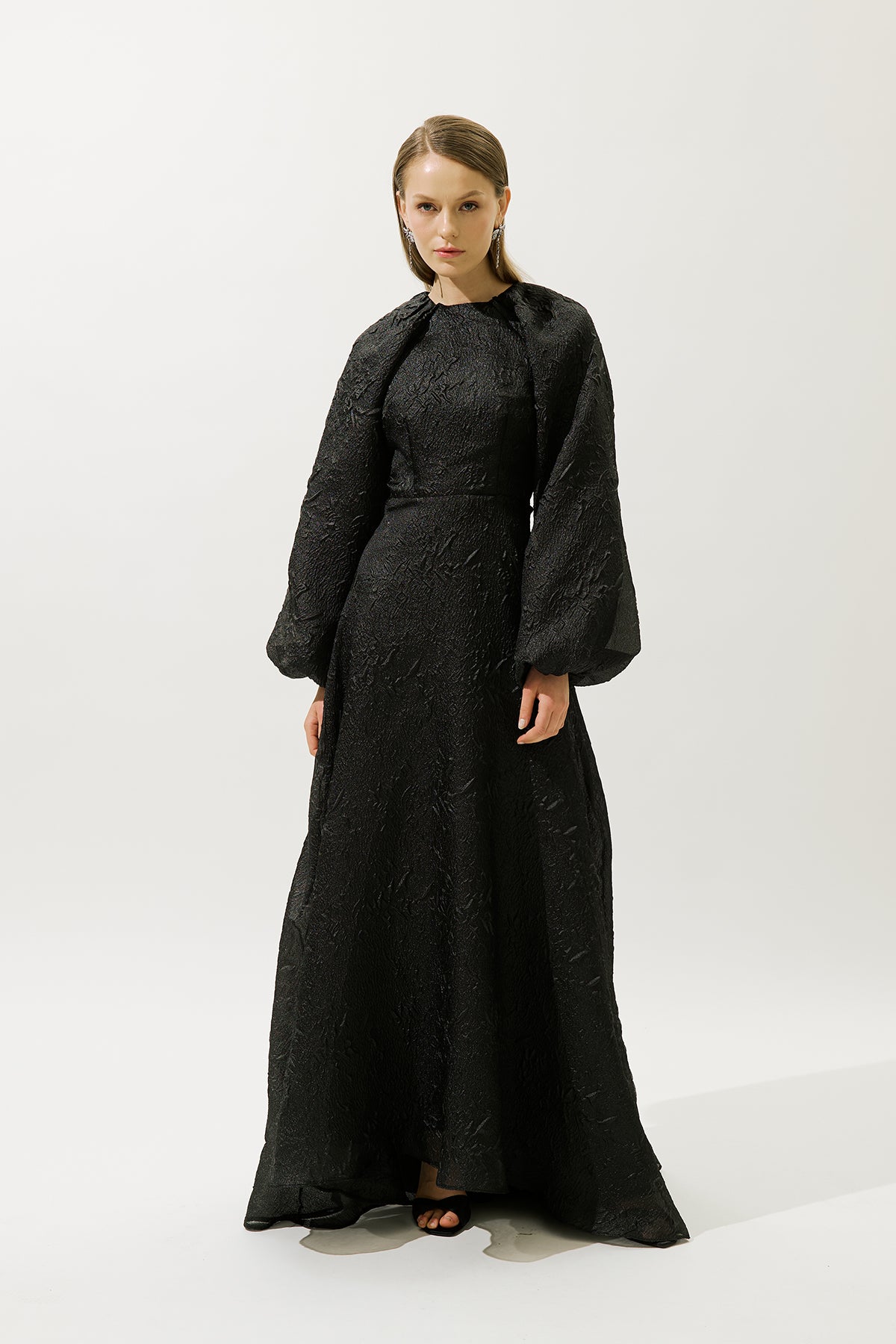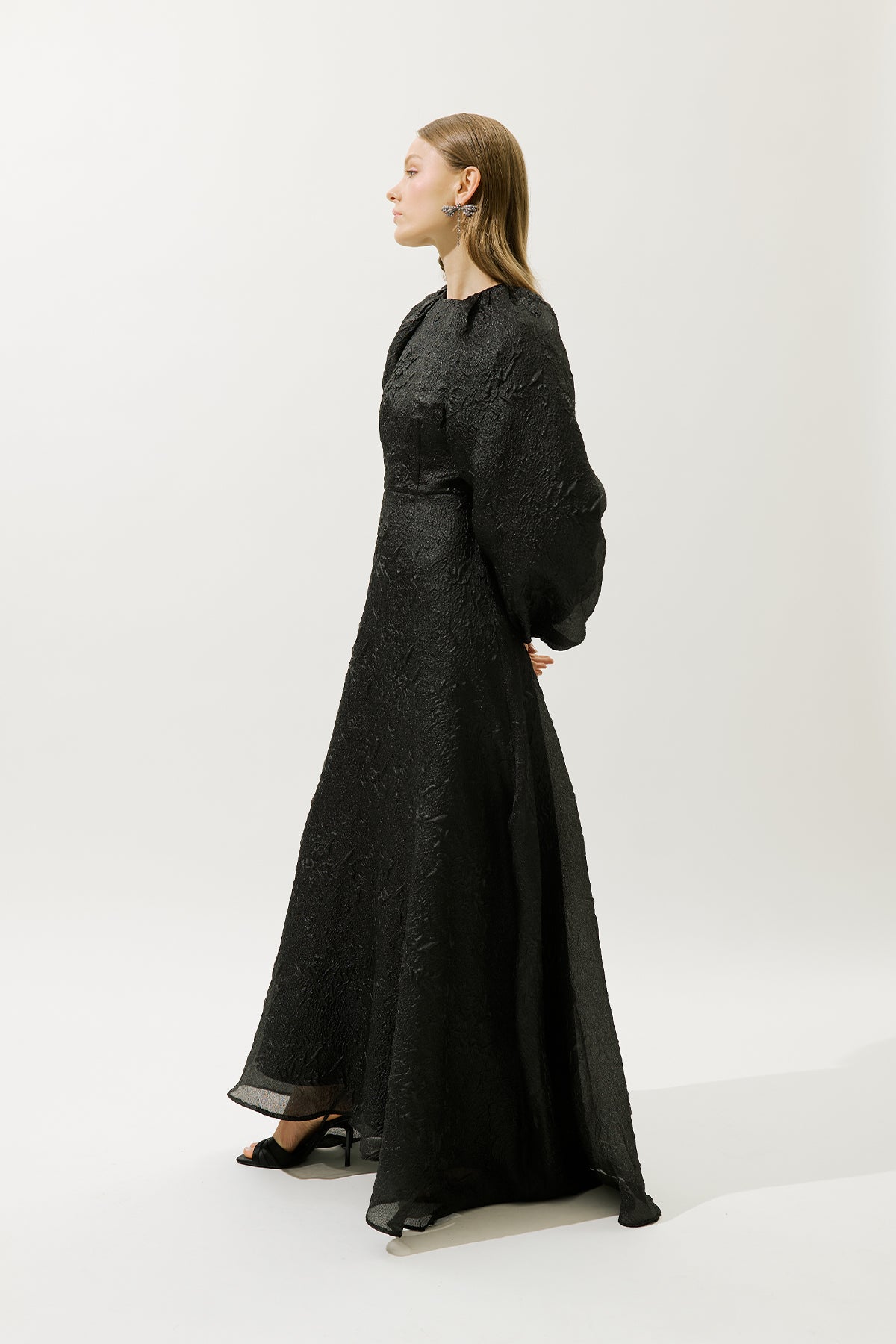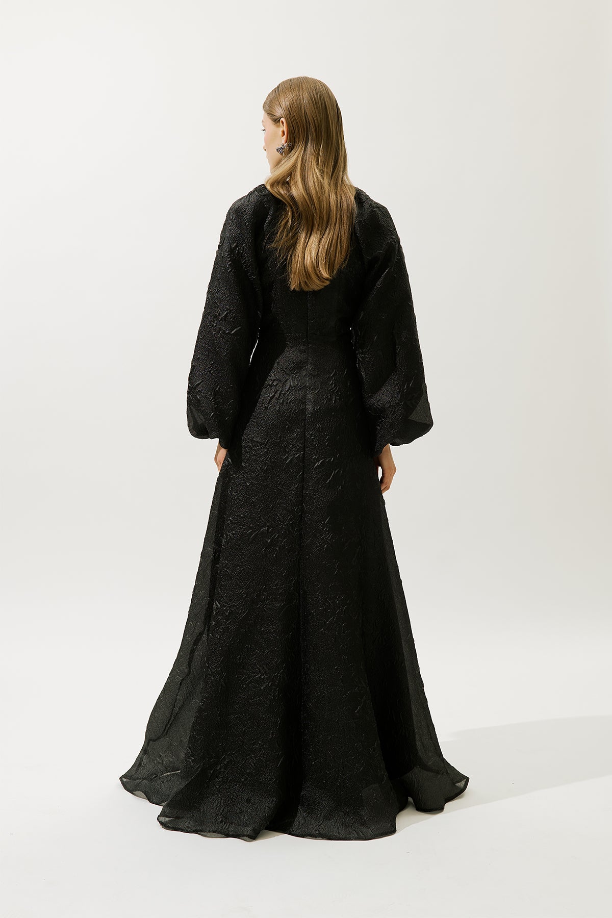 فستان سهرة من الأورجانزا المطرز بالجاكار باللون الأسود