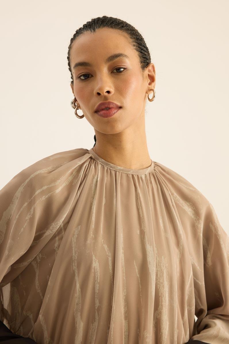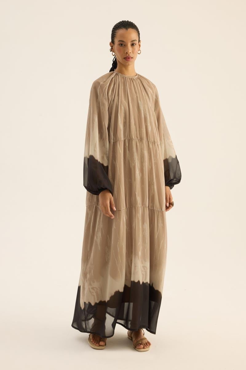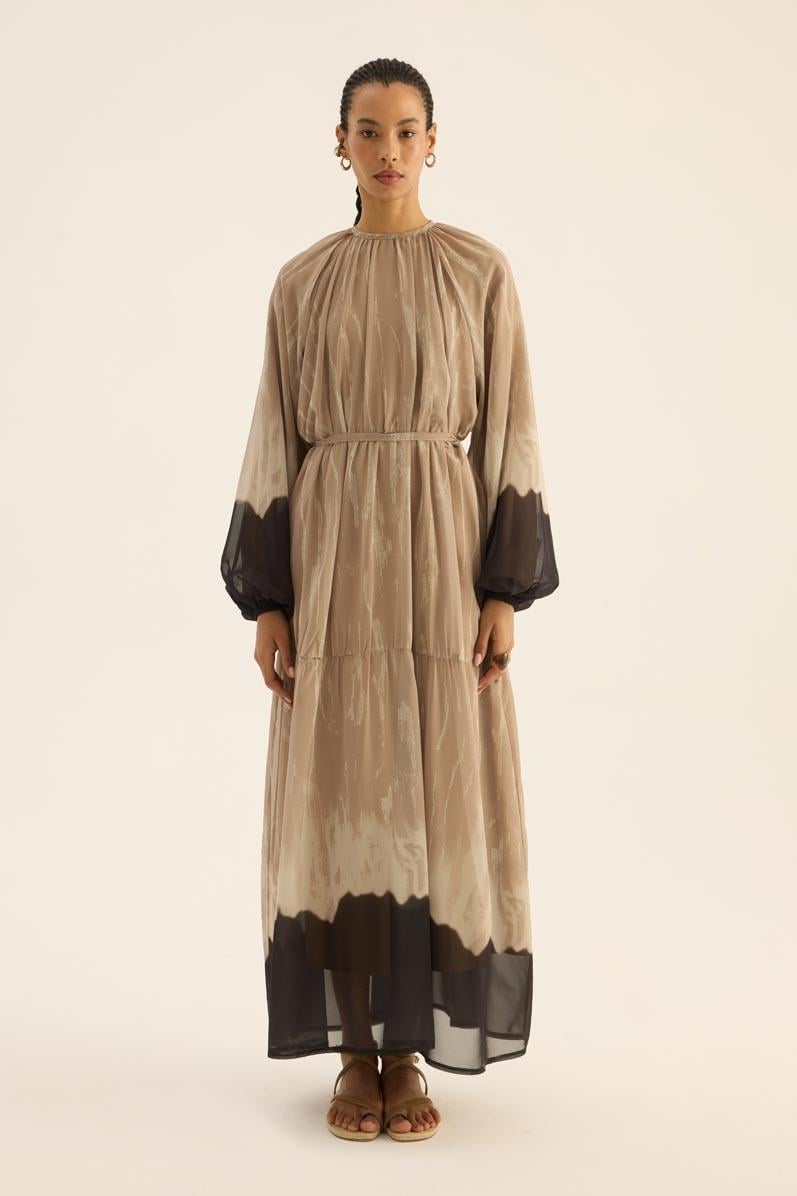 فستان شيفون بلون البيج بتصميم مزخرف عند الحاشية