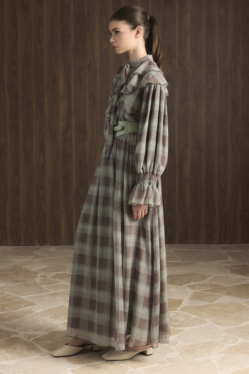 فستان شيفون أنيق بتصميم رقبة متميز مع كشكشة رقيقة ونمط مربعات كلاسيكي. يجمع موديل تشاغلا بين الأناقة والراحة، مثالي للمناسبات المختلفة.