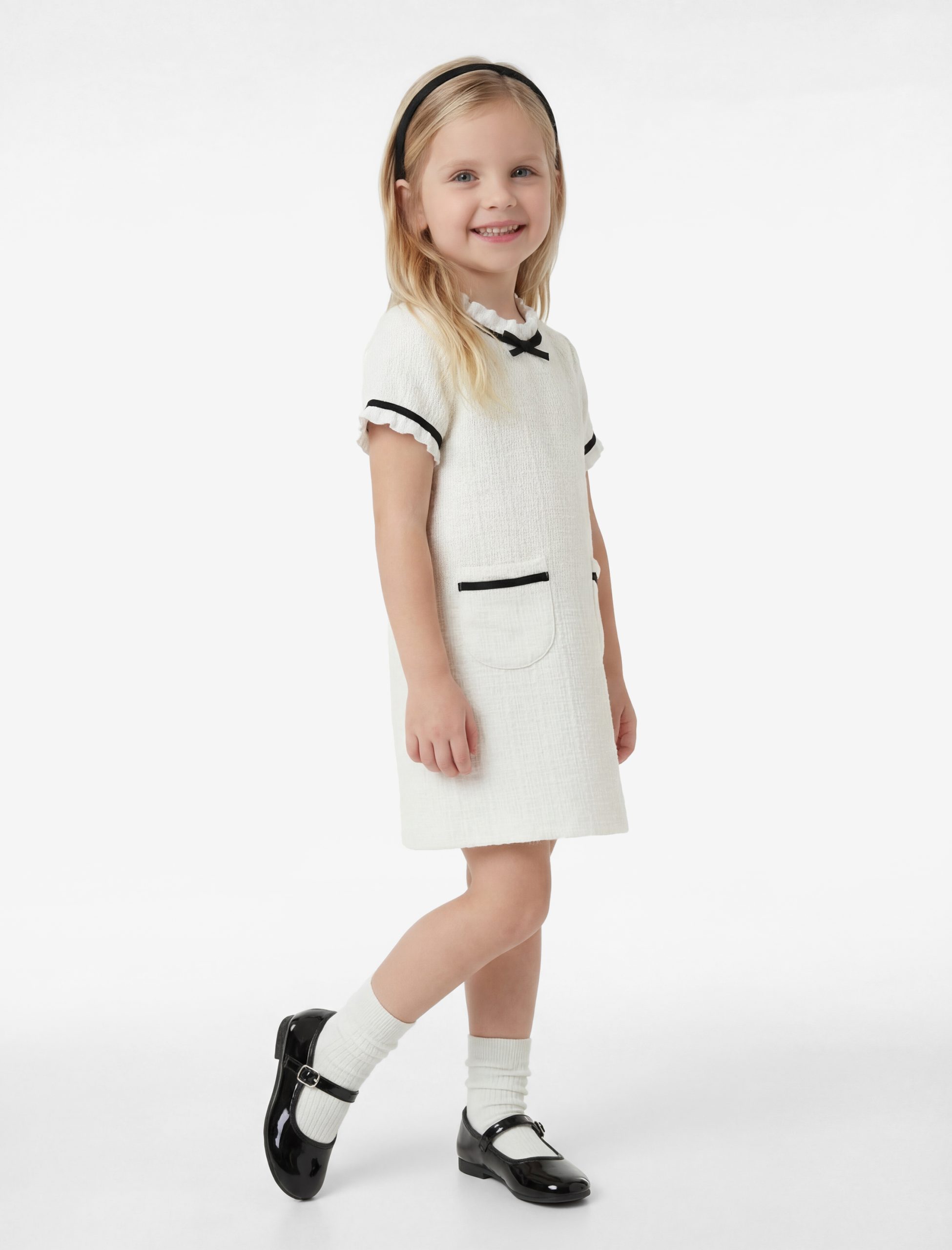 فستان فتاة بأكمام قصيرة وخط عنق مستدير وجيوب وتفاصيل ربطة