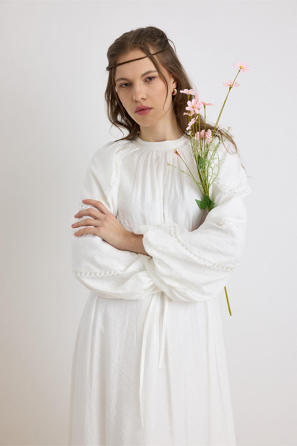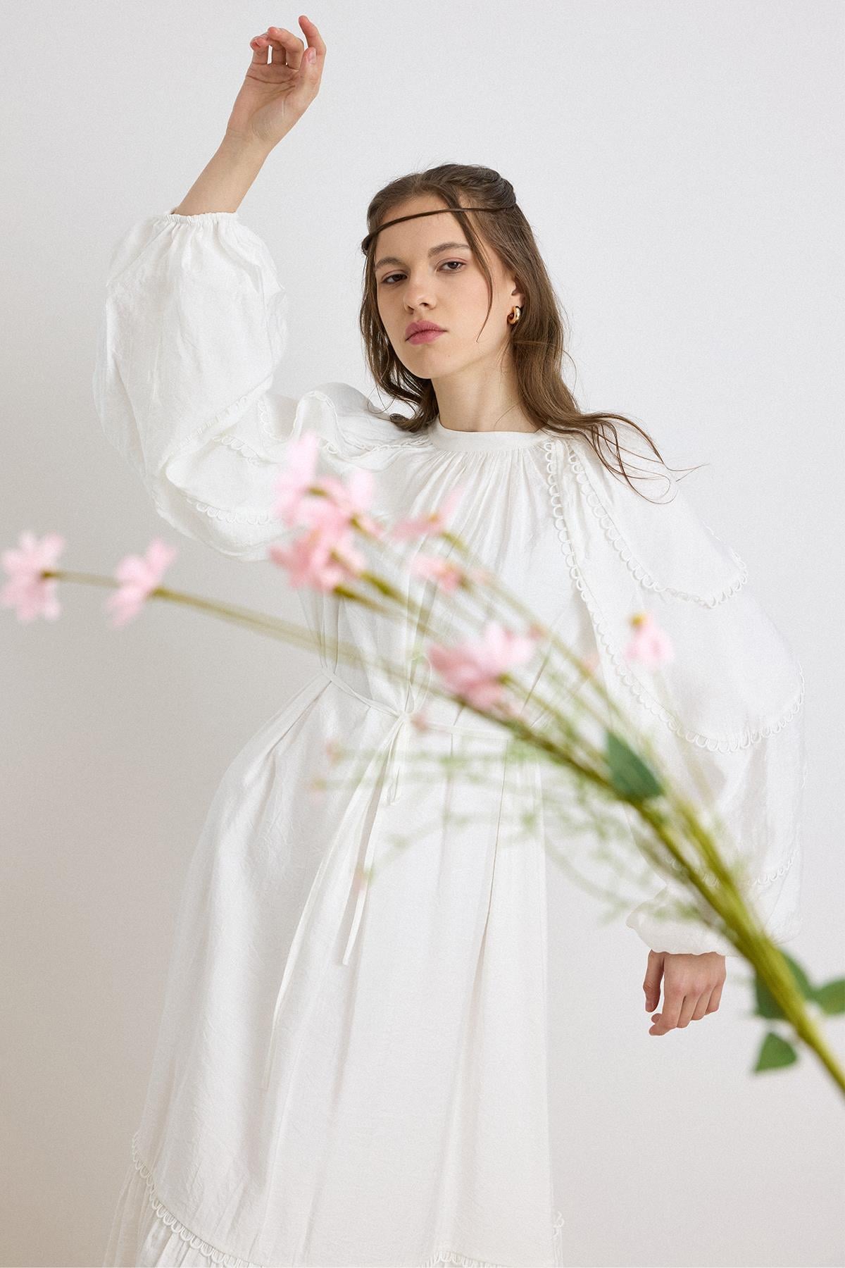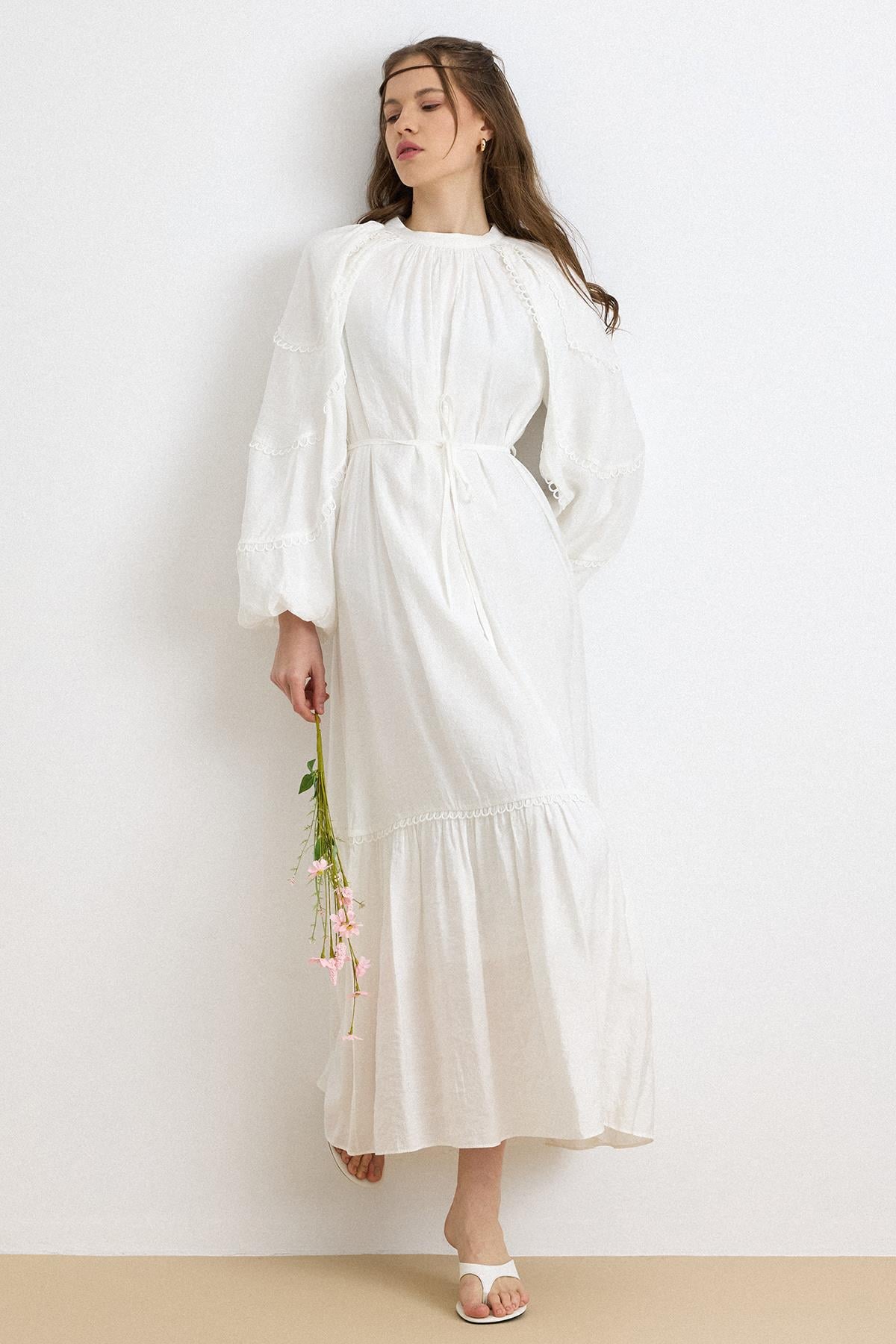 فستان قطني بأكمام بالونية وتفاصيل ذيل السمكة – أبيض 9427-E