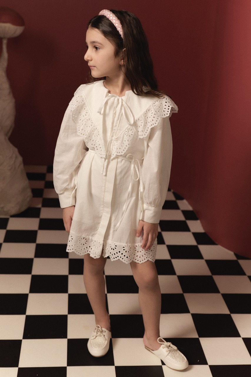 فستان كريب بيبي للبنات الصغيرات برقبة بيبي وتطريز دانتيل