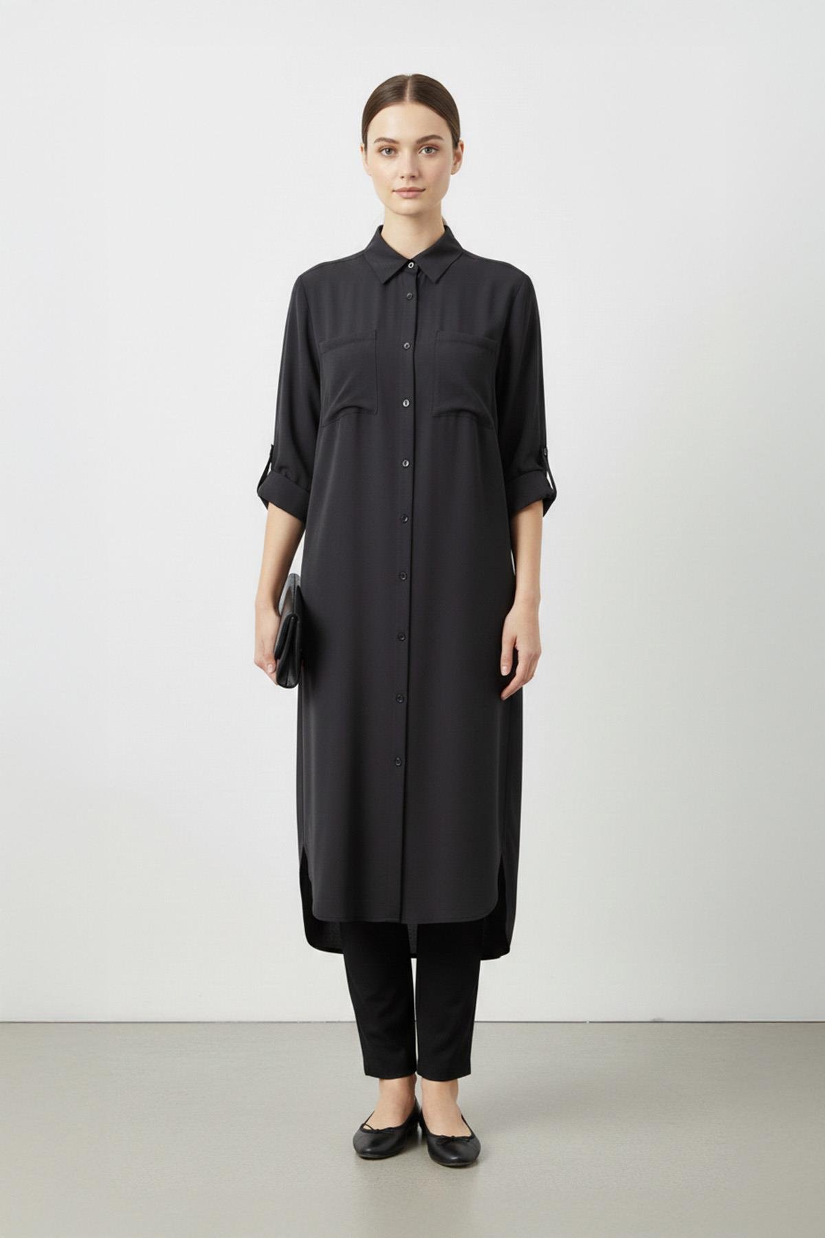 فستان قميص نسائي واسع بطول كامل بأزرار وجيوب -10764 – أسود