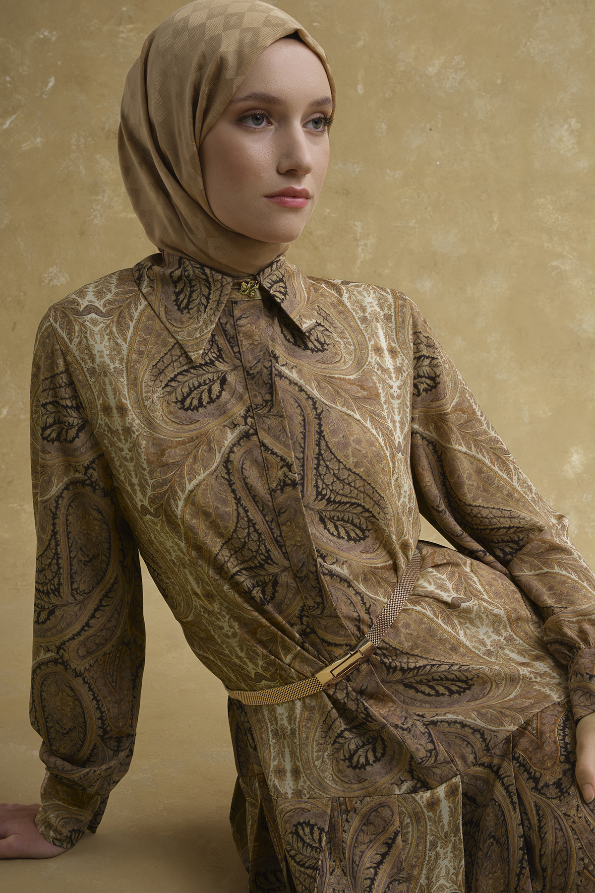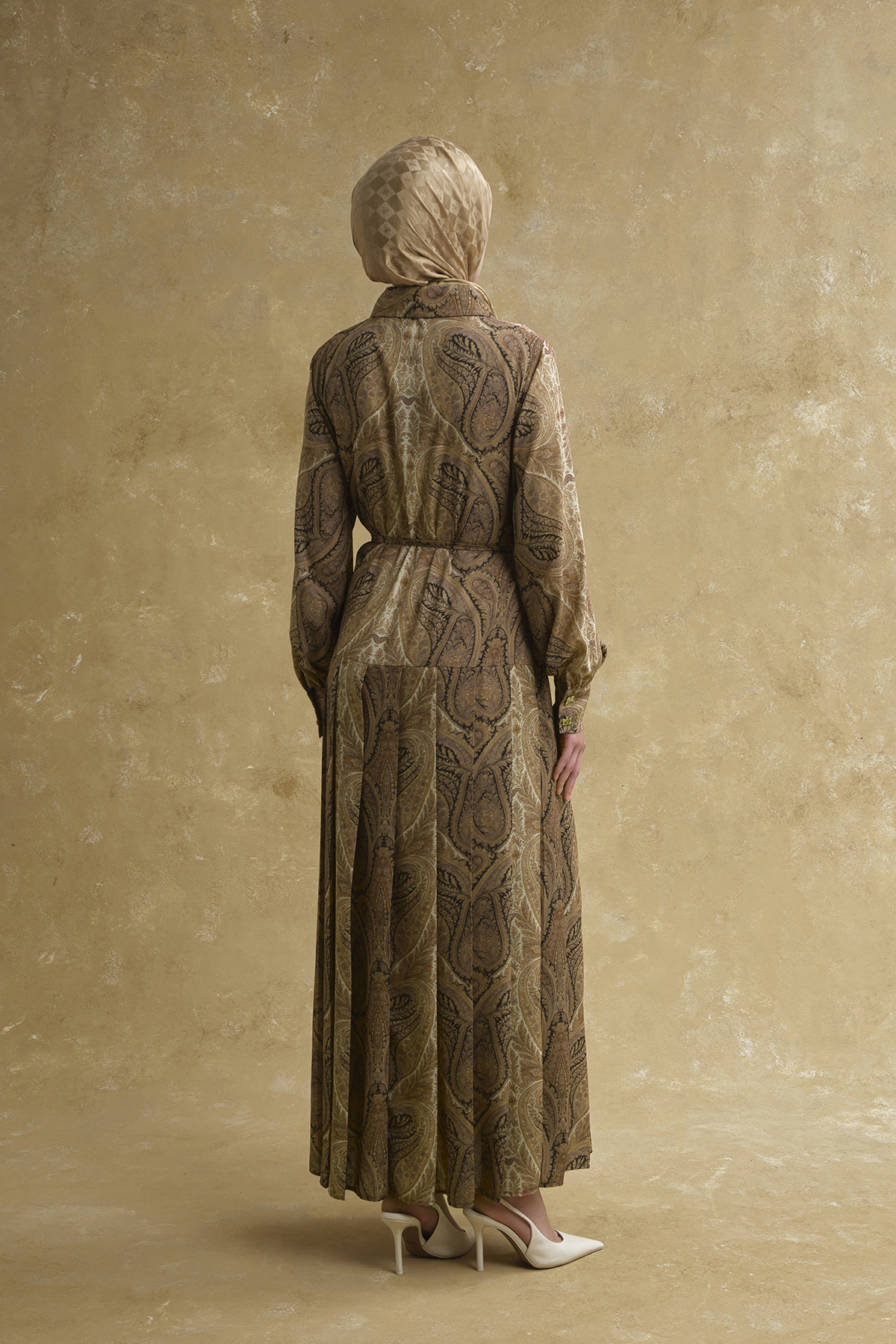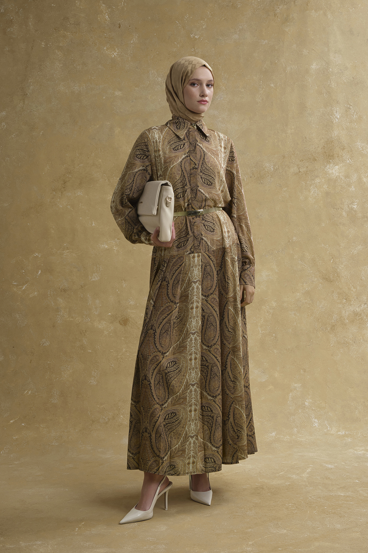 يبرز هذا الفستان بزخرفة الشال الخالدة، ويقدم مظهرًا أنيقًا بشكله المتدفق وخطوطه الطويلة. تفصيل الحزام عند الخصر يوازن نسب الجسم، بينما هيكله الخفيف والمتدلي يضمن الراحة طوال اليوم. يمثل بديلاً راقيًا لكل من الأناقة اليومية وتركيبات المناسبات الخاصة.