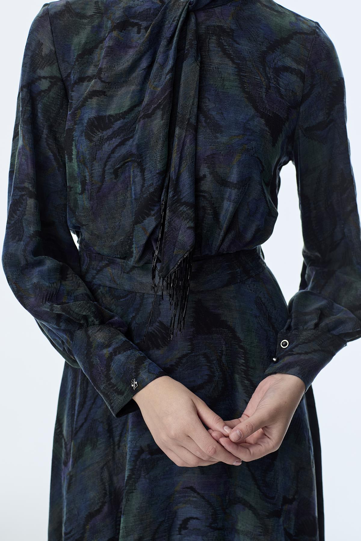 فستان كبرا حريري أزرق بتفاصيل الياقة E-0444