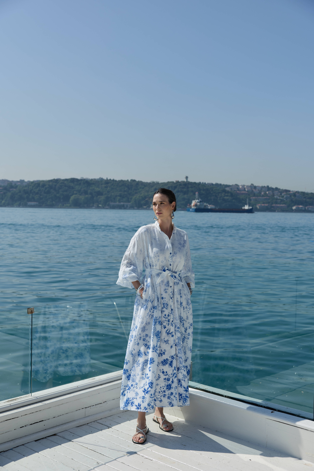 فستان من الكتان بتصميم متدرج الألوان. يحتوي على بطانة لا تظهر ما تحتها. الفستان مزود بحزام من نفس القماش. متوفر بمقاسات: مقاس 1 (36-38)، مقاس 2 (38-40)، مقاس 3 (42-44). قياسات المقاس 1: الصدر 107 سم، الخصر 115 سم، طول الكم 71 سم، طول المنتج 139 سم. المقاس المعروض على العارضة 1، قياسات العارضة: الطول 180 سم، الصدر 86 سم، الورك 94 سم.