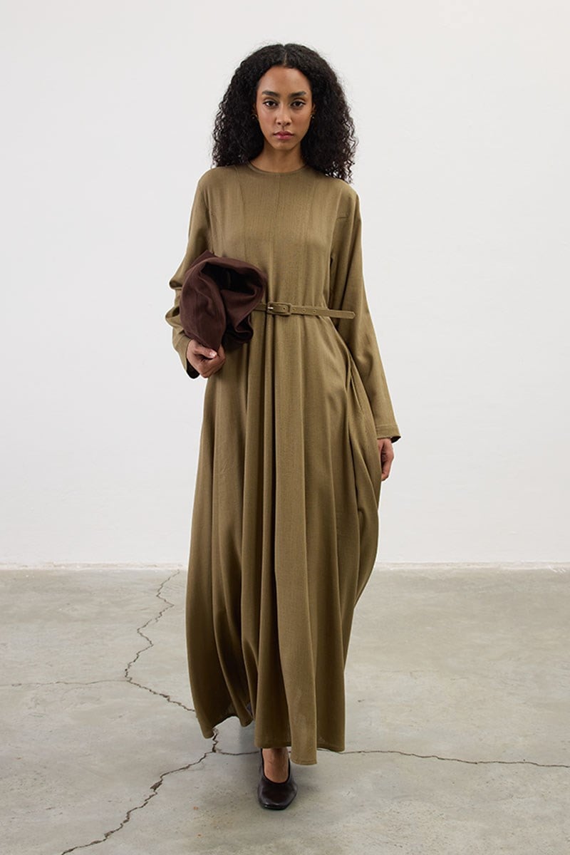 يبرز هذا الفستان الطويل بتصميم أنيق وتفاصيل عصرية، حيث يظهر وقفة مثالية بفضل قماش الترينش المتين والمرن في الوقت نفسه. تضيف التفاصيل المطوية في المقدمة حركة للتصميم، بينما يؤكد خط الخصر مع الحزام على منحنيات الجسم بأناقة. بطوله الكامل وتصميمه البسيط، يقدم خياراً أنيقاً للمناسبات الخاصة وللستايل الحضري.