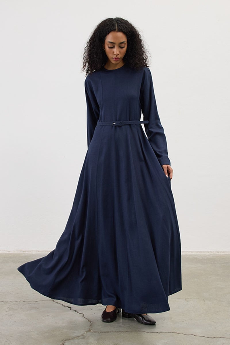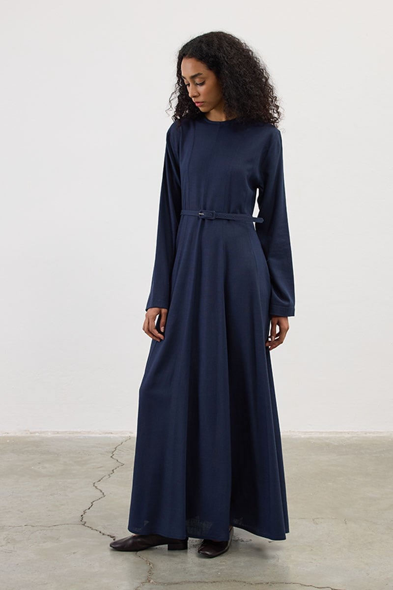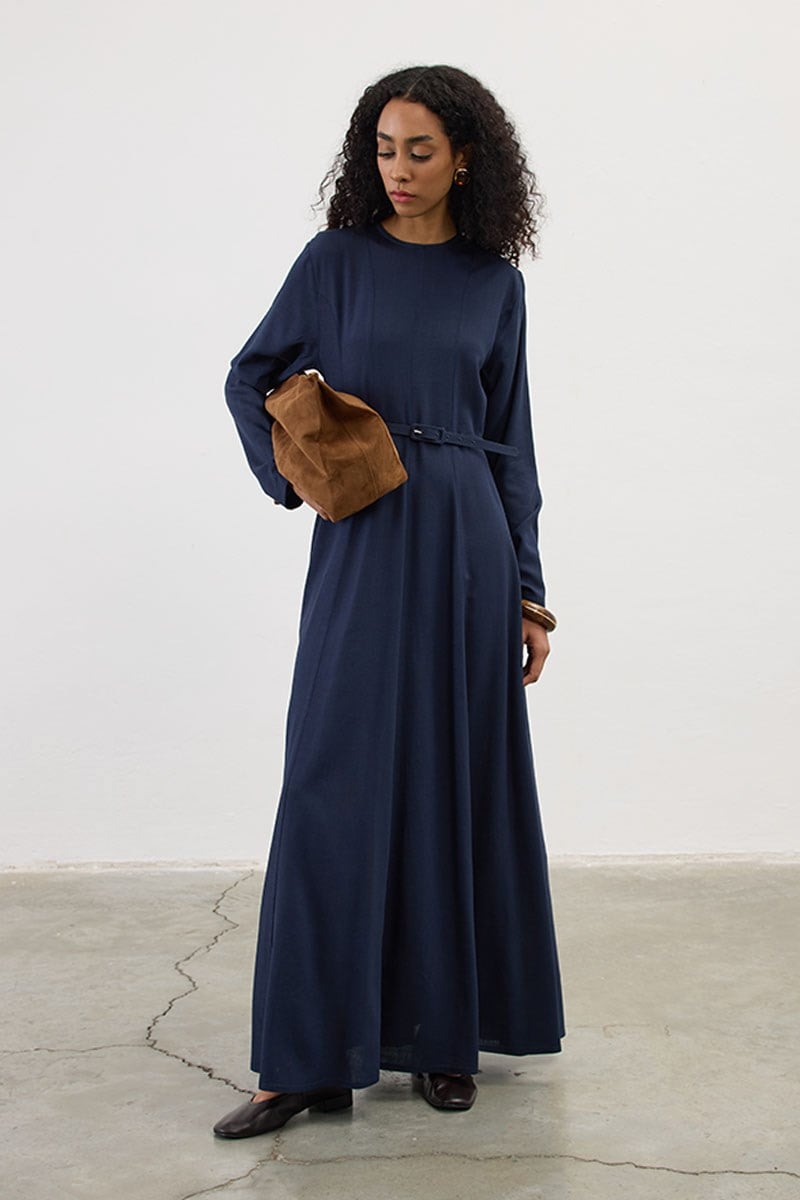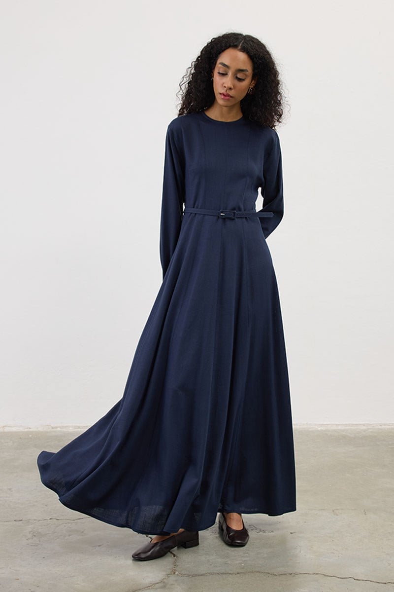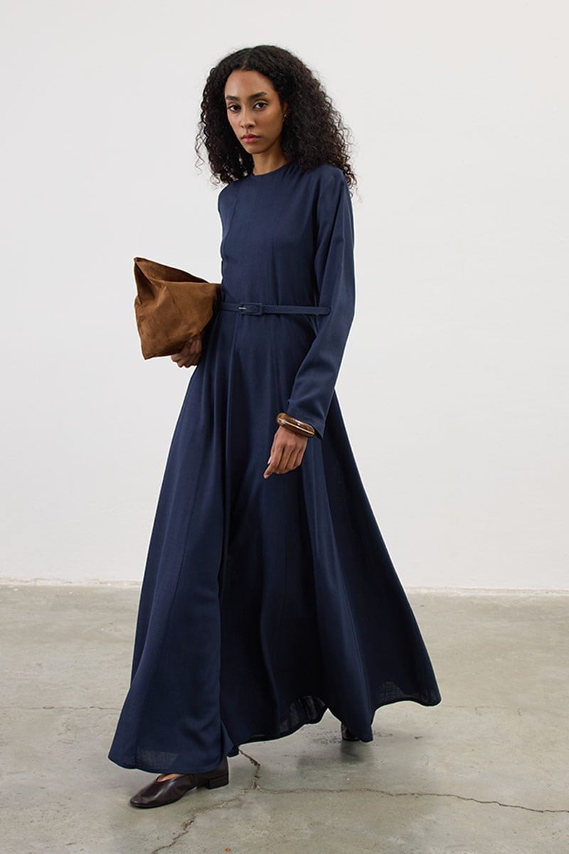يبرز هذا الفستان الطويل بتصميم أنيق وتفاصيل عصرية، حيث يظهر وقفة مثالية بفضل قماش الترينش المتين والمرن في الوقت نفسه. تضيف التفاصيل المطوية في المقدمة حركة للتصميم، بينما يؤكد خط الخصر مع الحزام على منحنيات الجسم بأناقة. بطوله الكامل وتصميمه البسيط، يقدم خياراً أنيقاً للمناسبات الخاصة وللستايل الحضري.