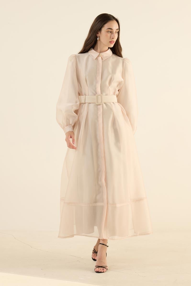 يقدم هذا الفستان بتصميمه المكشكش الذي يتبع خطوط الجسم بأناقة، سيلويتًا متناسقًا ومنظمًا. بينما يمنح قماشه المتين شكلاً أنيقًا للموديل، تضيف طبقات الكشكشة حركة وتفاصيل دقيقة للفستان.